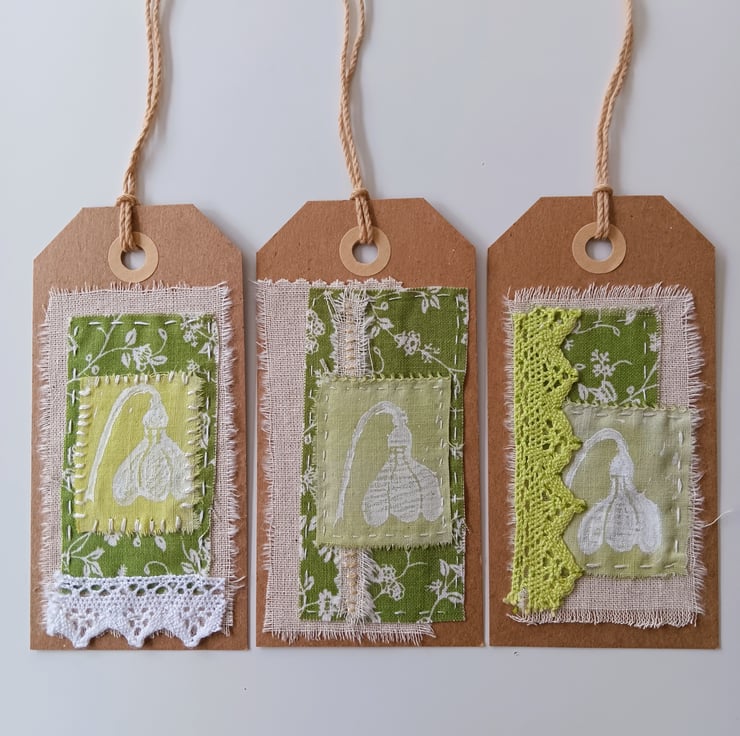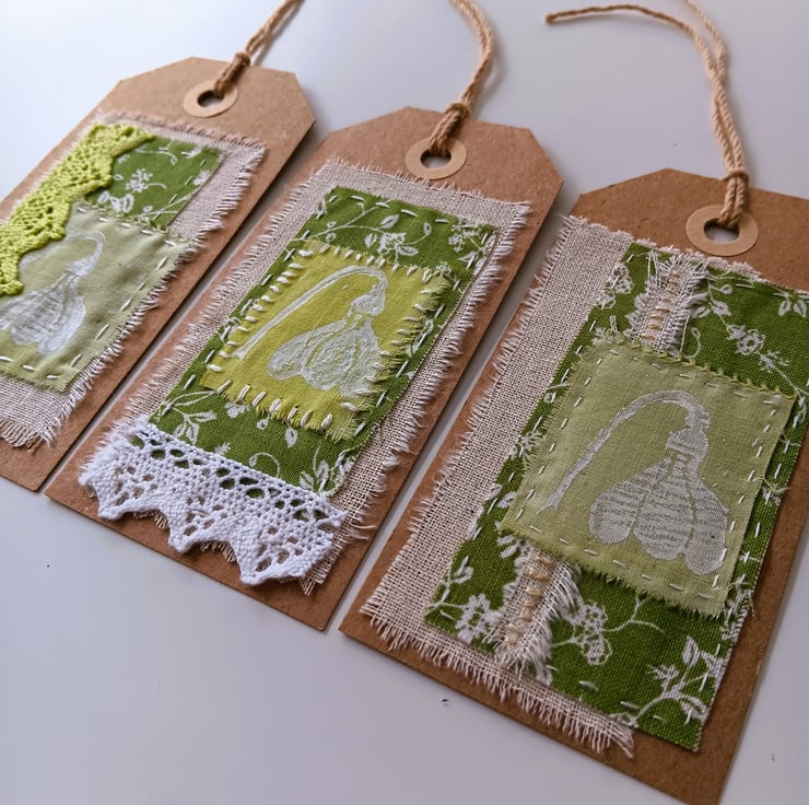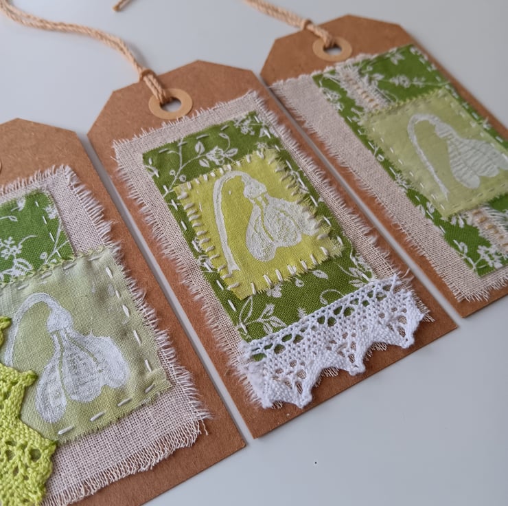 These pretty gift tags each feature small textile collages made with hand painted and commercial fabrics in a fresh spring green colour palette.