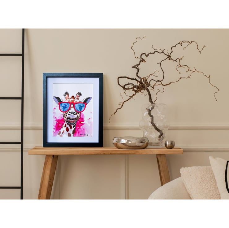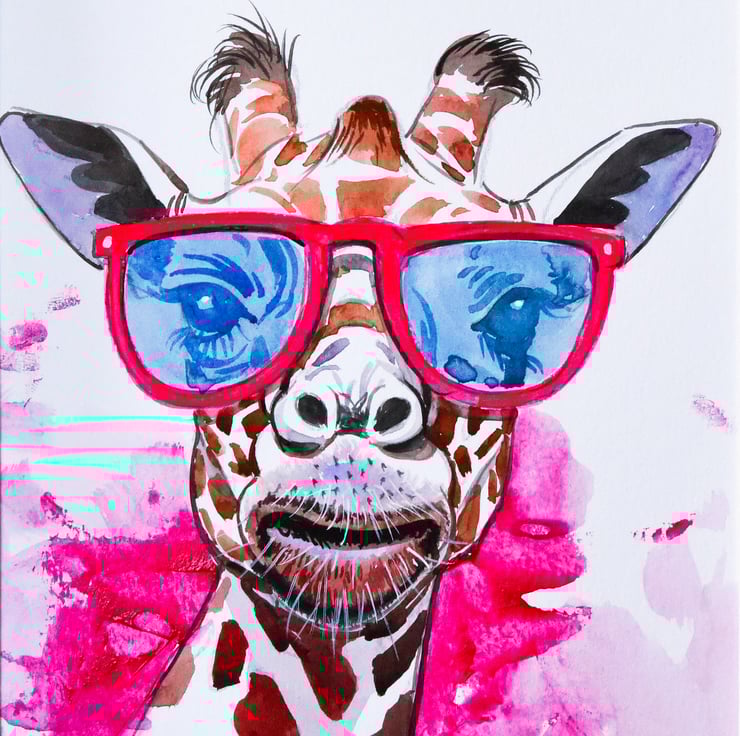 A giraffe peers out through oversized crimson glasses, its calm, knowing gaze softened by cool blue reflections. Loose washes of pink and white frame the face, blending playfulness with quiet dignity, as the familiar animal becomes a whimsical portrait of character and charm.