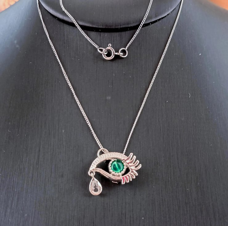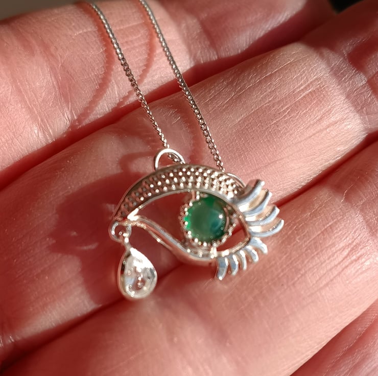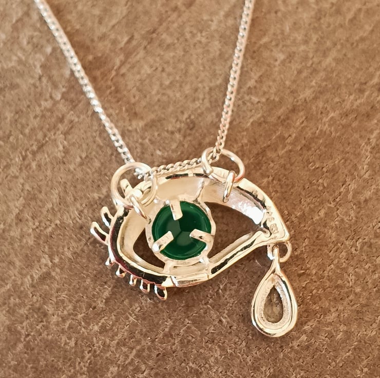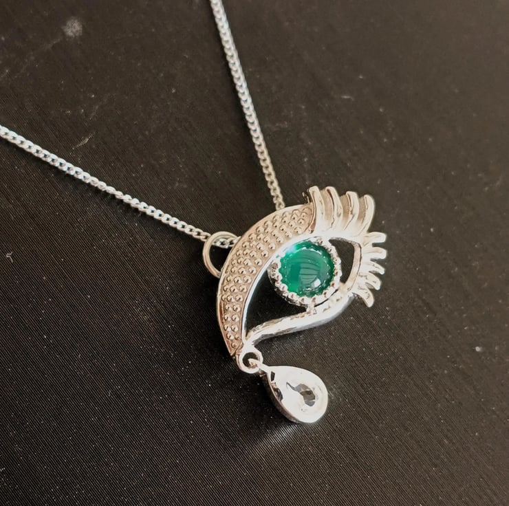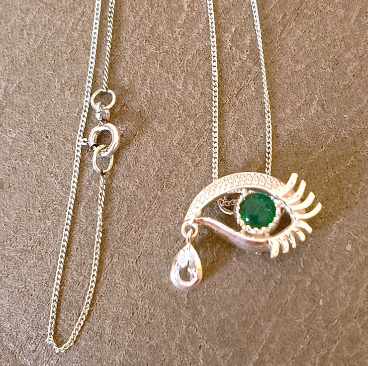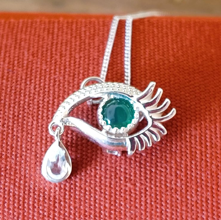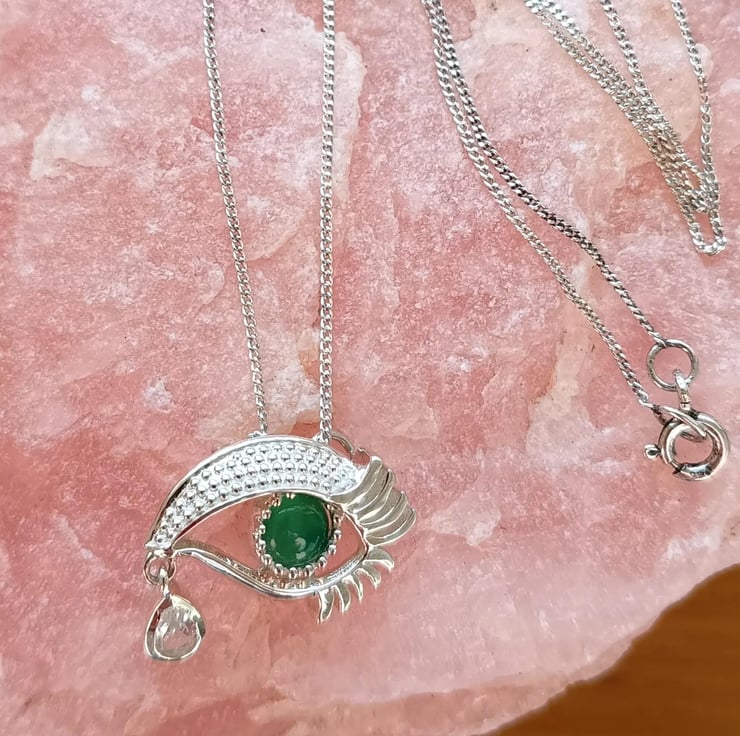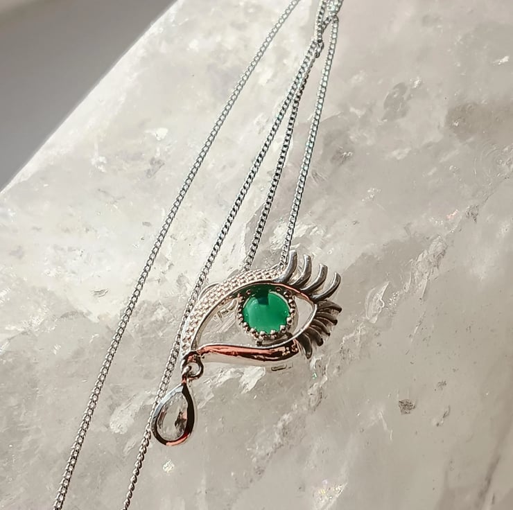 A piercing green onyx gemstone, eye of protection pendant. Suspended from the eye is a sparkling 5x3mm brilliant cut, natural white Topaz teardrop, bezel set, to highlight this stunning eye jewel. A symbol of beauty, allure, wisdom and a window to your soul. It is also believed to be an amulet for guidance and protection. The 925 sterling silver eye pendant is finished with a flattering length, 20 inch fine curb chain.