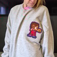 This one-of-a-kind sweatshirt features a dark, horror-inspired twist on a classic retro game character, hand-embellished with rhinestones, beads and layered detailing.