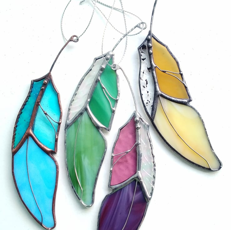 Each feather is uniquely hand crafted from quality stained glass, hammered copper wire and decorated with solder details. Finished with a variety of patina.