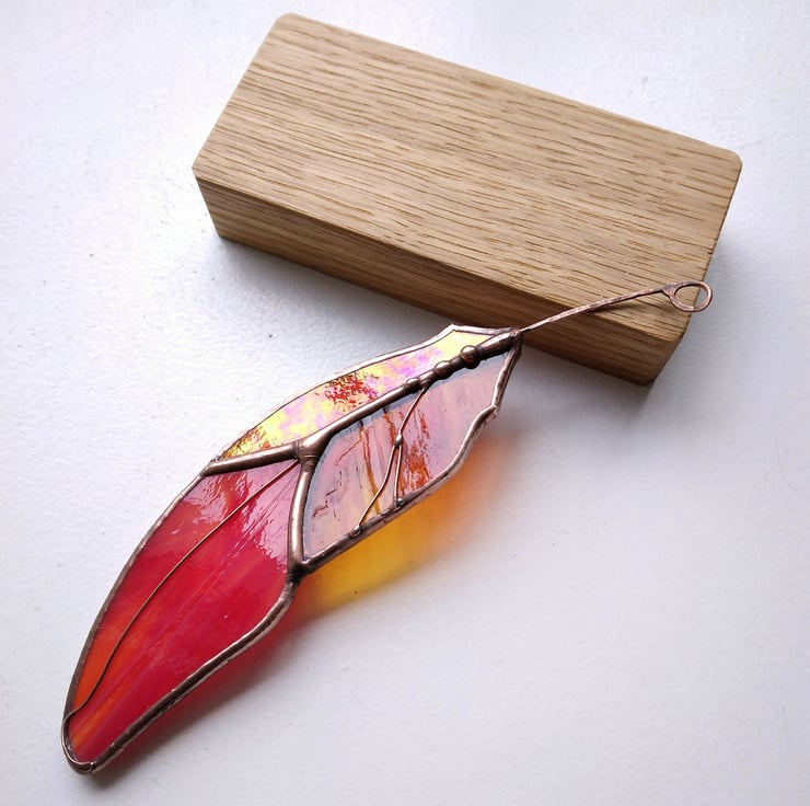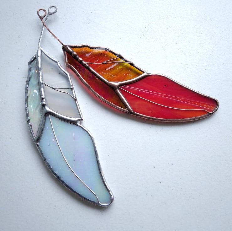 Each feather is uniquely hand crafted from quality stained glass, hammered copper wire and decorated with solder details. Finished with a variety of patina.
