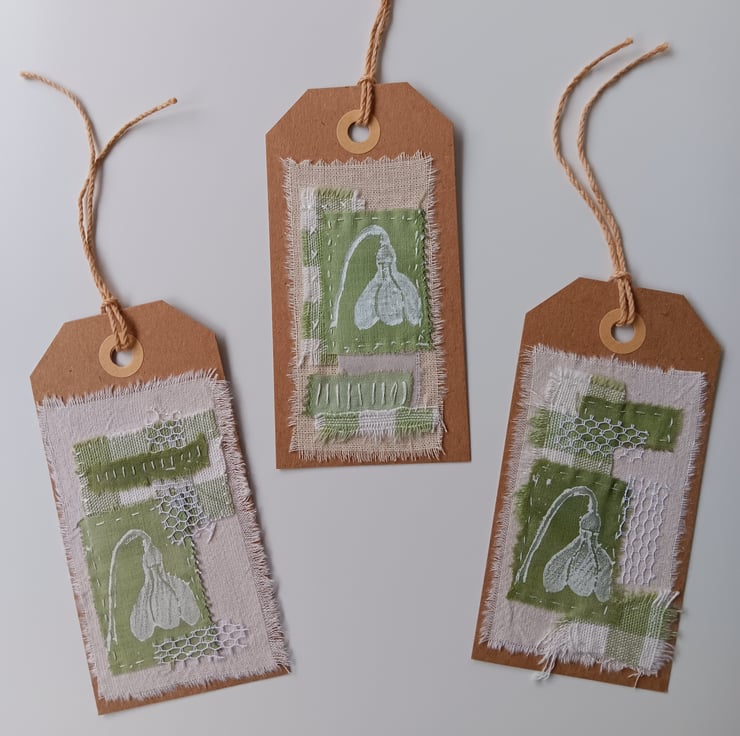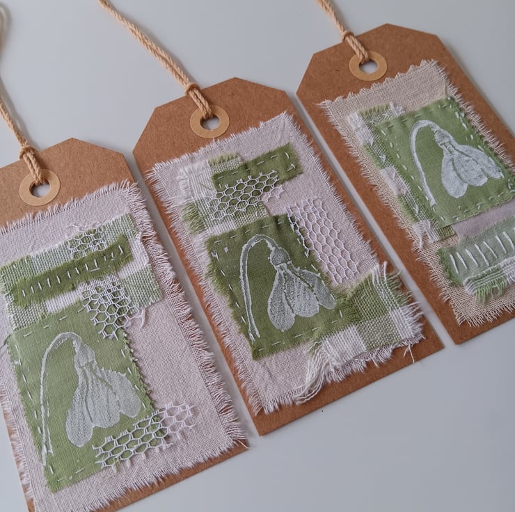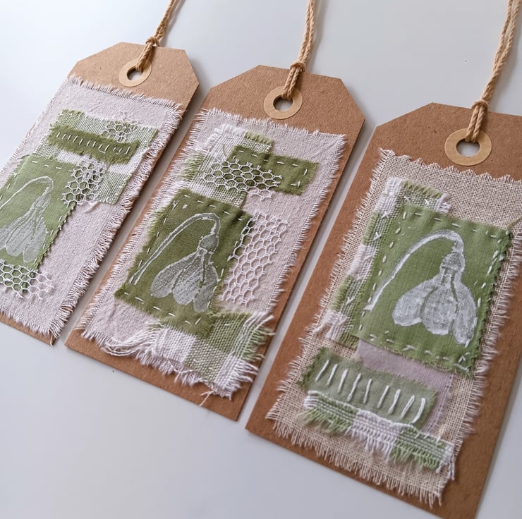 These pretty gift tags each feature small textile collages made with hand painted and commercial fabrics in a fresh spring green colour palette.