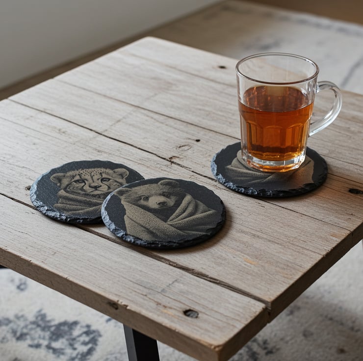 We love all things wood and slate. We love making attractive drink coasters. These featuring baby Cheetah and bear We designed and loved how cute there are. We used our natural round slate which we treated. This allowed the engravings to shine.