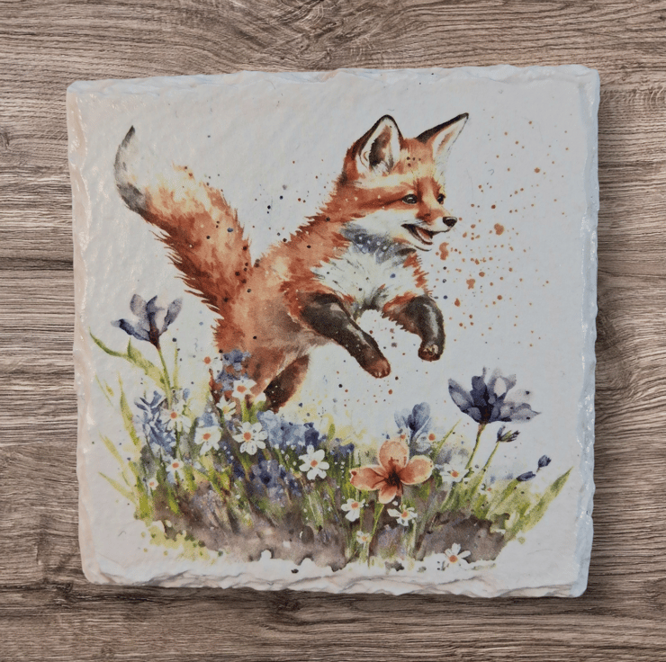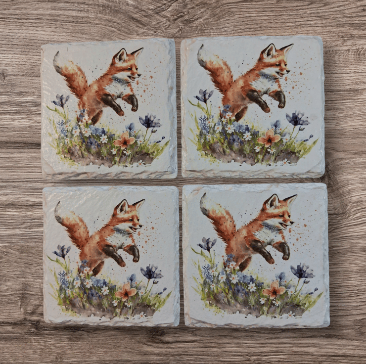 This 4 piece slate coaster set has been hand painted and decoupaged with a beautiful fox leaping.