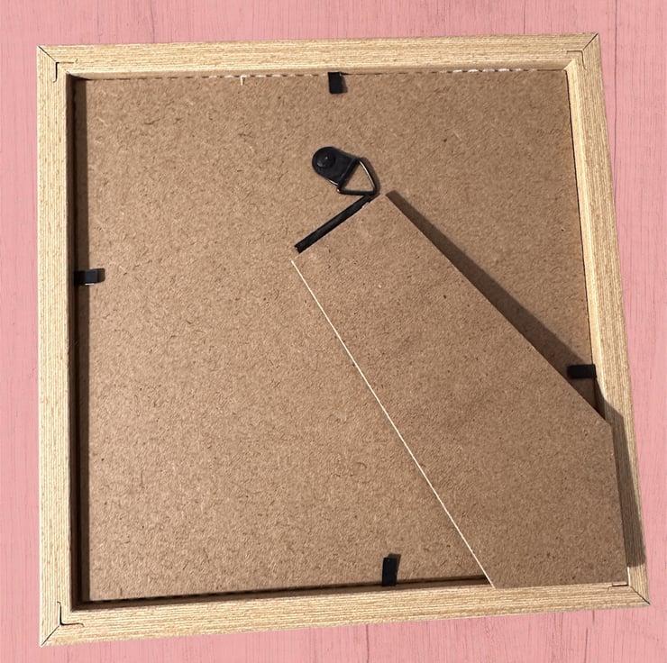 The light coloured wooden frame measures: 25 x 25cm It has a Perspex front for safety. .