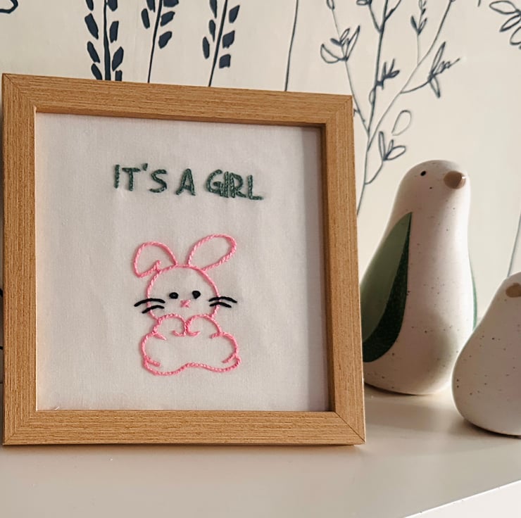 Beneath the words “it’s a girl” stitched in a soft pastel sage green, a sweet pink rabbit sits proudly, full of charm and character with her expressive little face and one floppy ear.