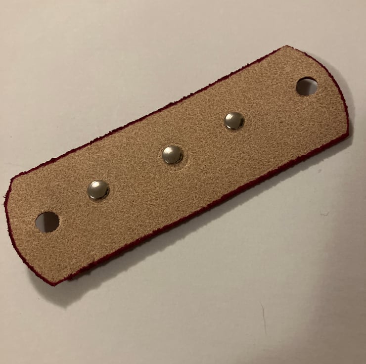 Shape: Rectangle ... Size: roughly 4” ... Hand dyed red // acrylic finishing spray to seal in leather dye