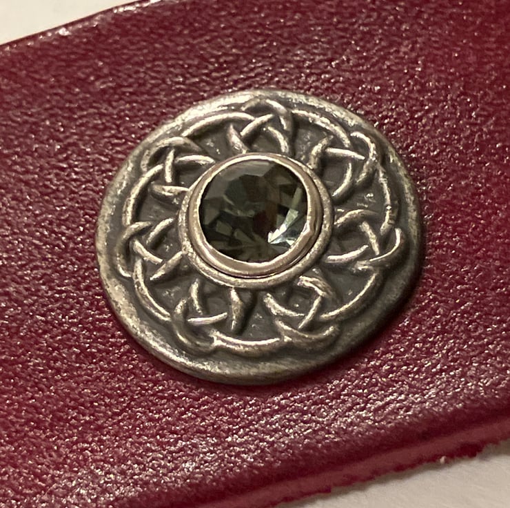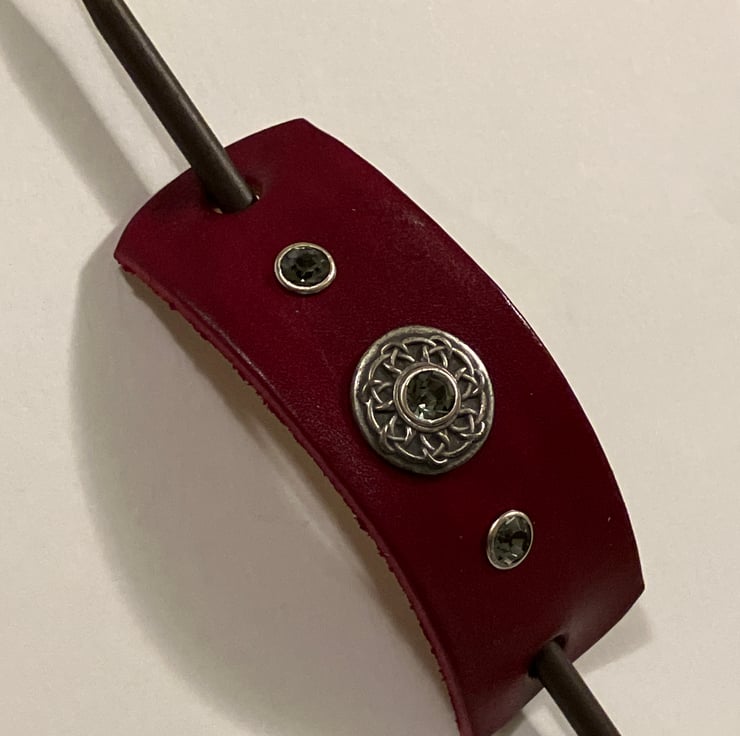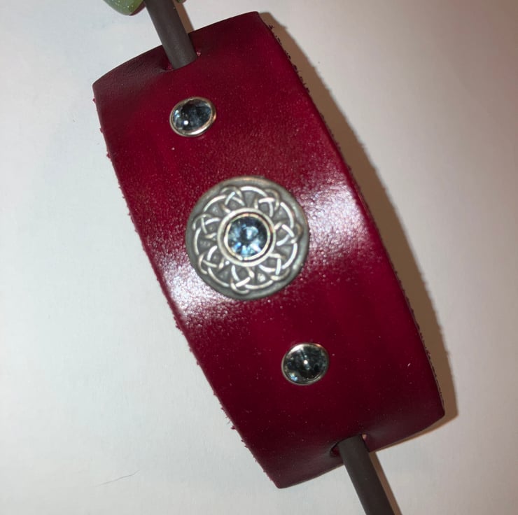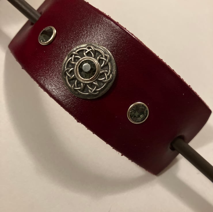 Dyed Red Leather Hair Stick Barrette - Celtic Knotwork Concho with 3 Grey (light black) Gemstones