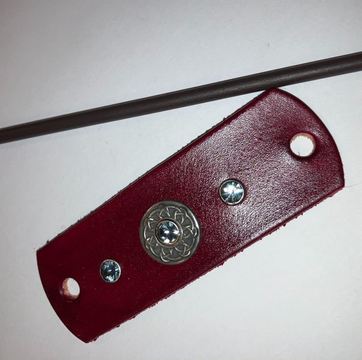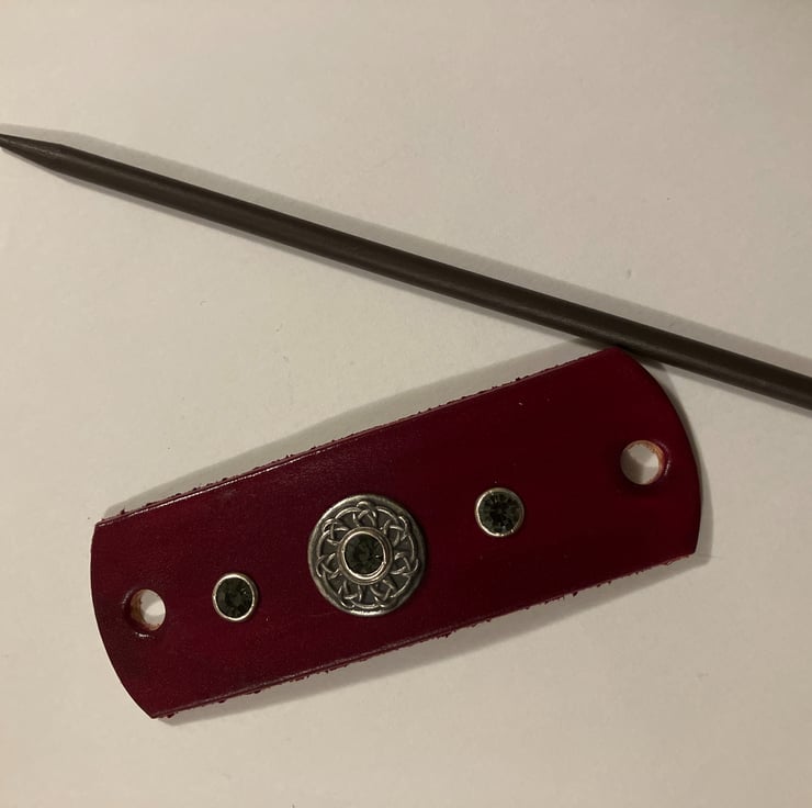 The black wood hair stick is 6" in length. 2 Grey/light black Gemstones are riveted onto the leather, flanking the Celtic Knotwork Centre (held in place with an additional light-black/grey gemstone riveted onto the leather). (see backside of hair stick barrette)