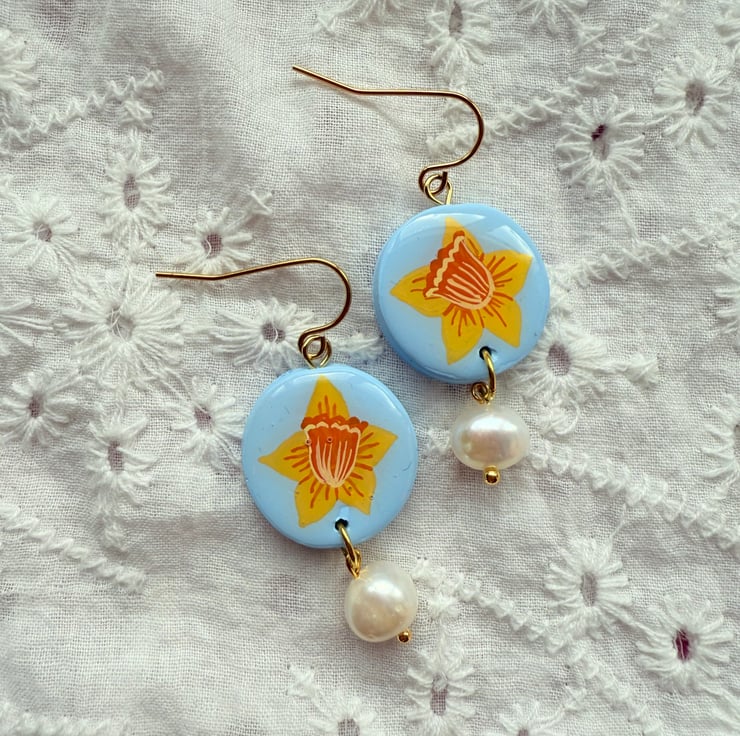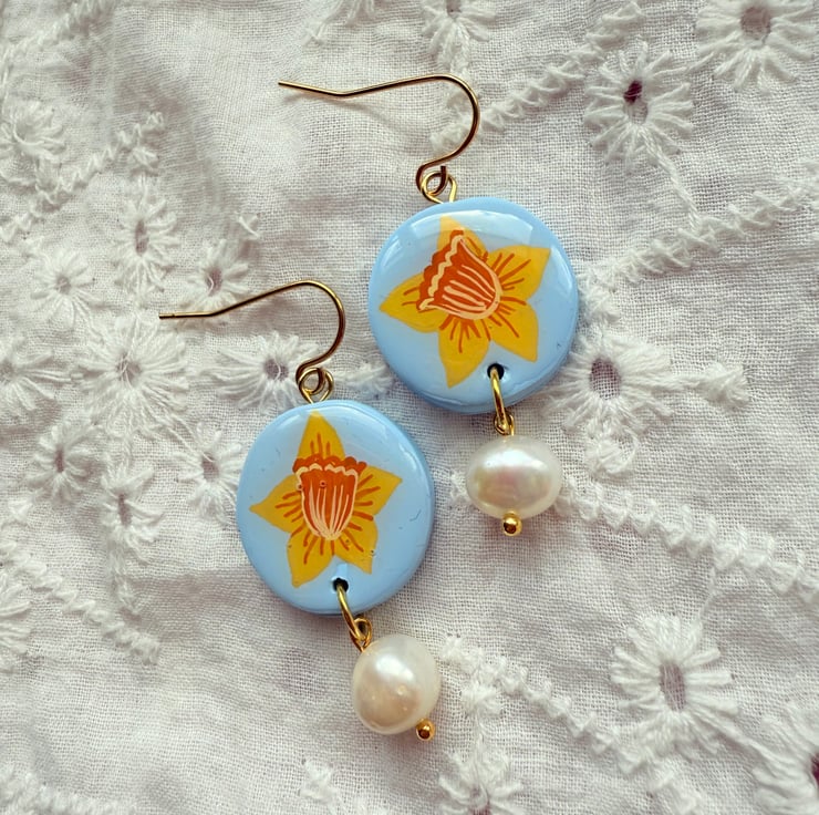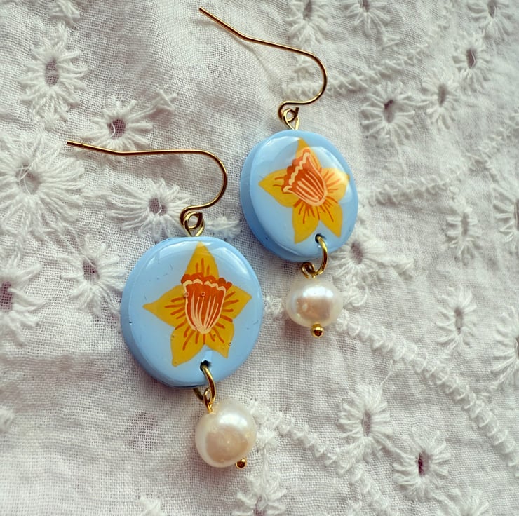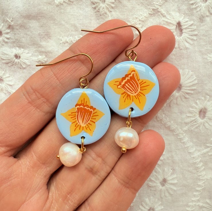 - Powder Blue Oval shaped polymer clay earrings with hand painted Yellow Daffodil Flowers.
