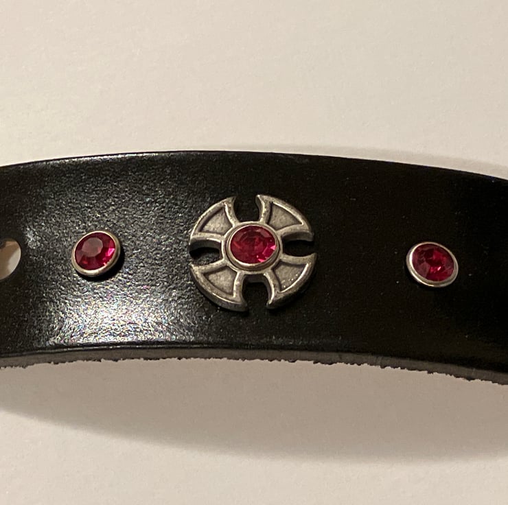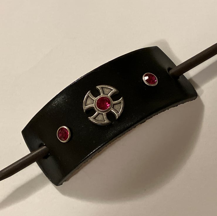 Dyed Black Leather Hair Stick Barrette - Iron Cross Concho with 3 light Red Gemstones