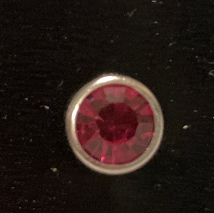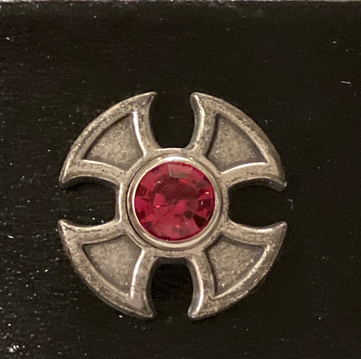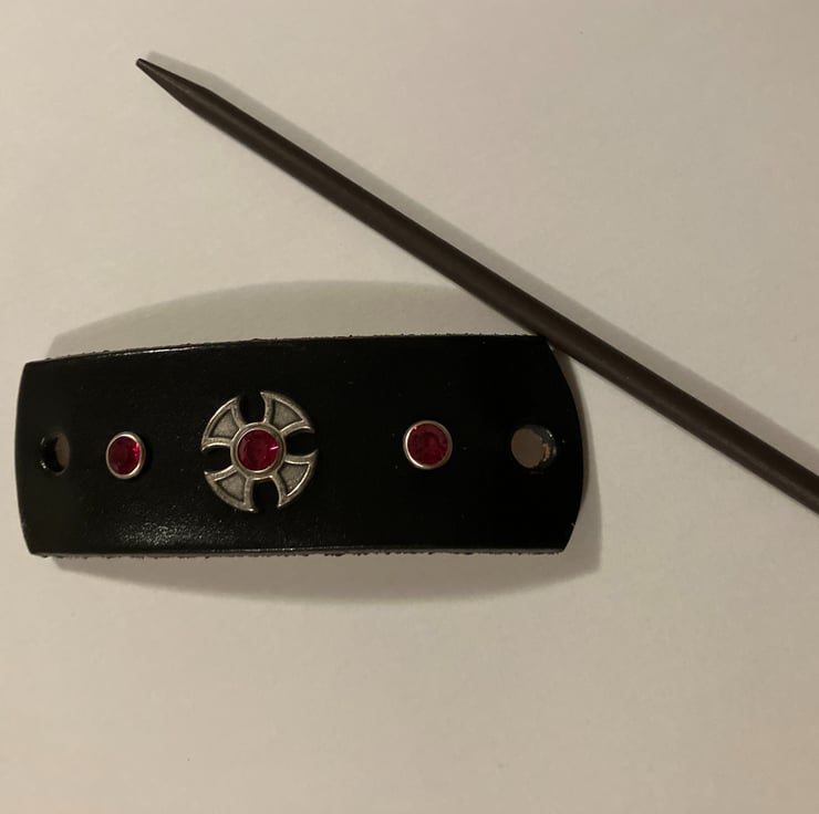The black wood hair stick is 6" in length. 2 light Red Gemstones are riveted onto the leather, flanking the Iron Cross Centre (held in place with an additional light red gemstone riveted onto the leather). (see backside of hair stick barrette)
