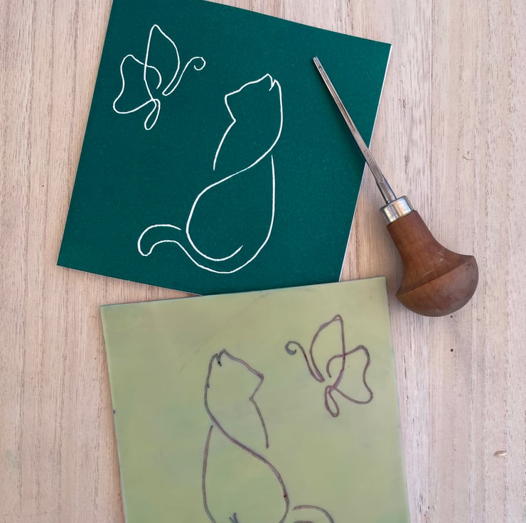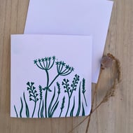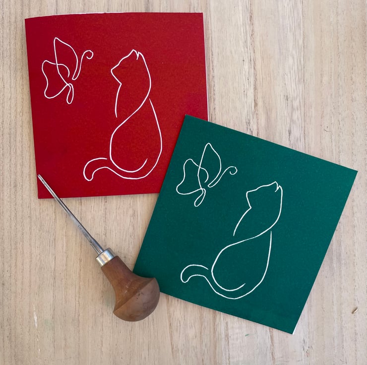 Hand printed card of a line image of a cat and a butterfly. This is hand printed using a Lino block that I have carved. As each card is hand printed there can be slight variations in ink transfer but this is part of the character of Lino print. This is for the green version of this card and it is also available in red, if you would like another colour please contact me and I can see what I can do - be aware that ink needs to dry before I can send out custom coloured cards.