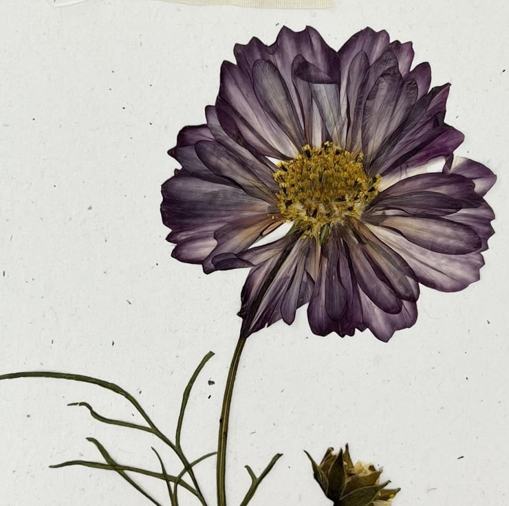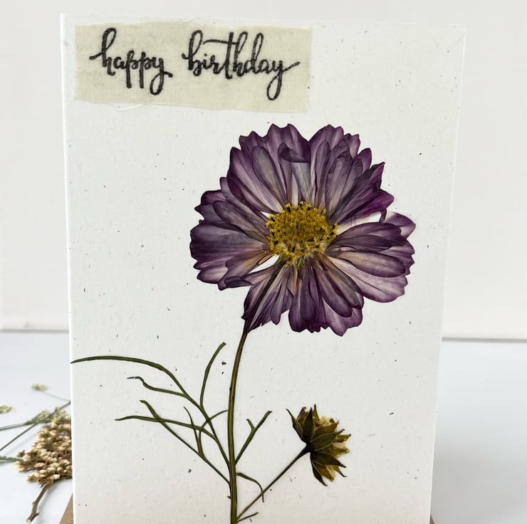 This lovingly handmade real pressed flower greeting card is made using cosmos grown from seed in our garden. With a hand printed message.