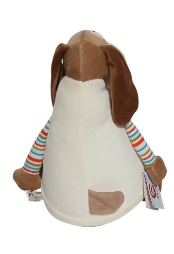 This unique 'character' is Berkley Bone. He is based on a dog with a loveable expression on his face and one eye. He is made from a cream soft, plush fabric with the arms and legs are in a contrasting stripe fabric and are lightly padded.