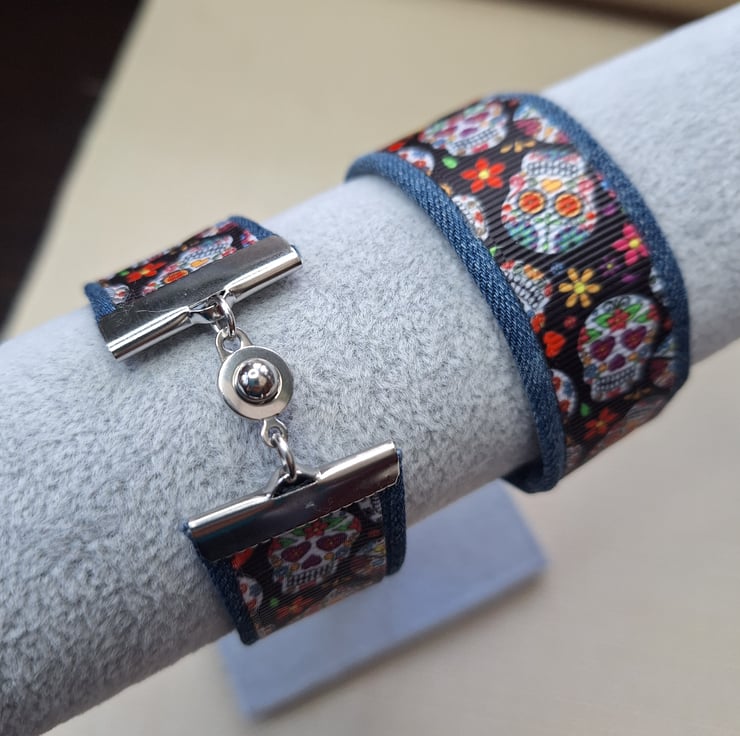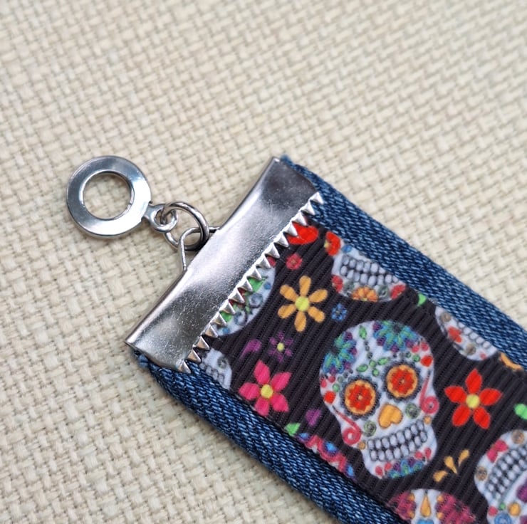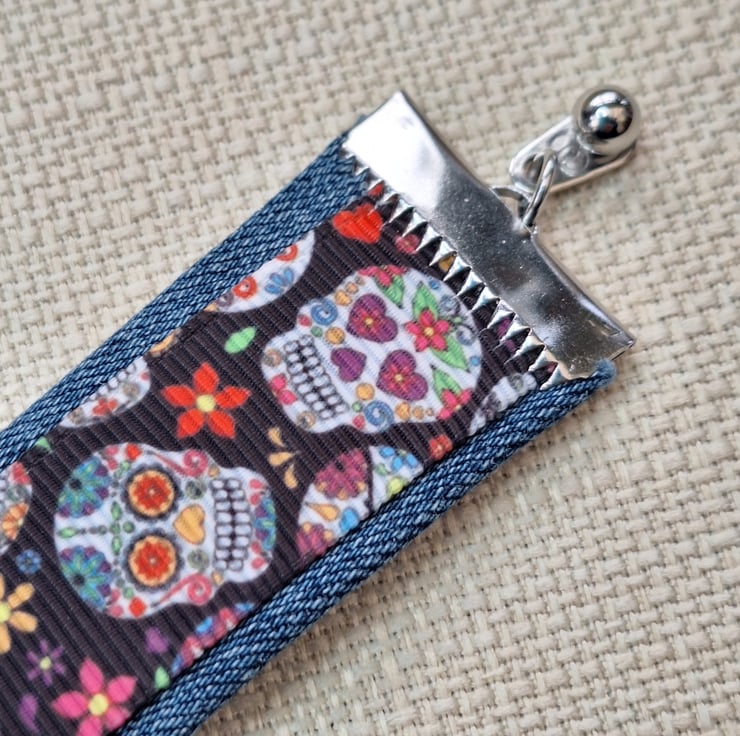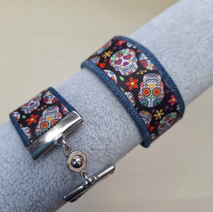 Upcycled Denim Skull Bracelet – Gothic Wristband with Mexican Calavera Ribbon