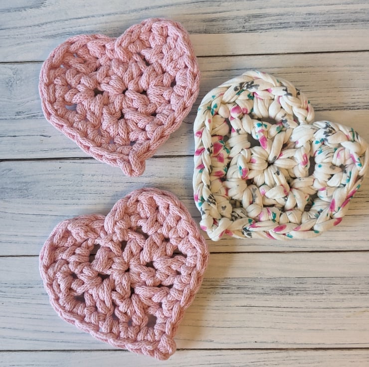 I love making coasters to decorate my own home with and wanted some heart shaped ones. I couldn't find a pattern that worked with the thick T shirt yarn and braided cord that I use a lot so I had to design crochet patterns for both materials.