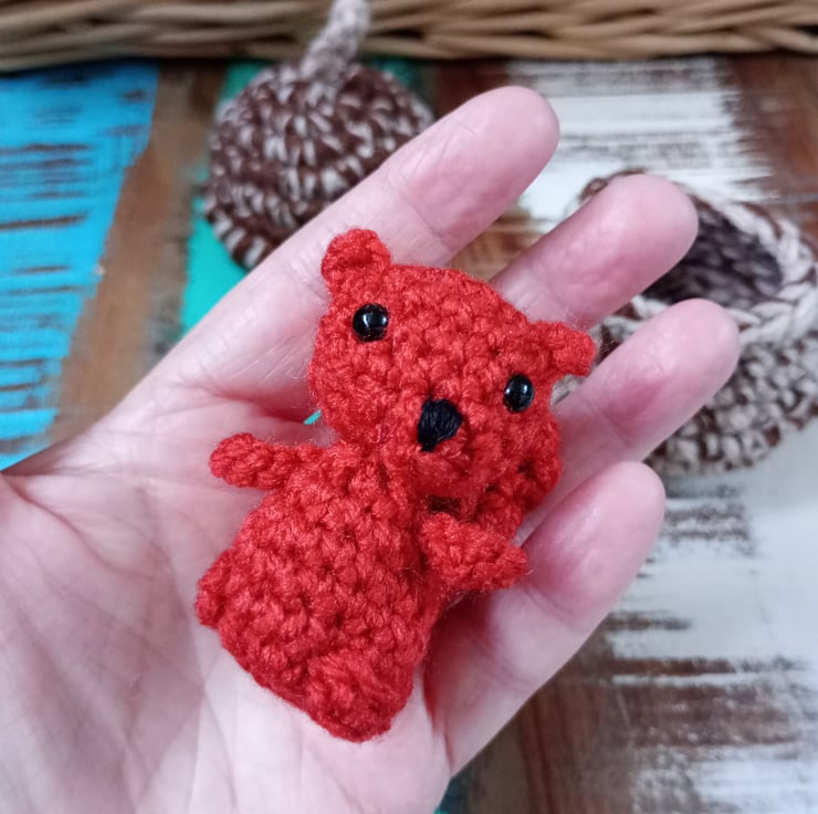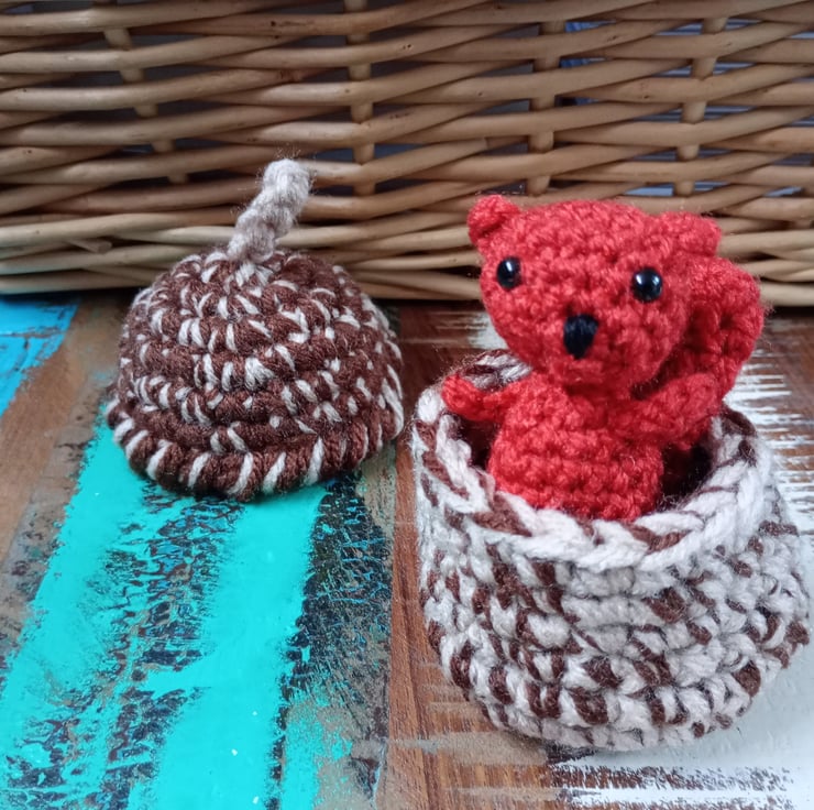 A tiny crocheted baby red squirrel hiding inside a tiny crocheted acorn basket. Lift the lid and out pops the squirrel.