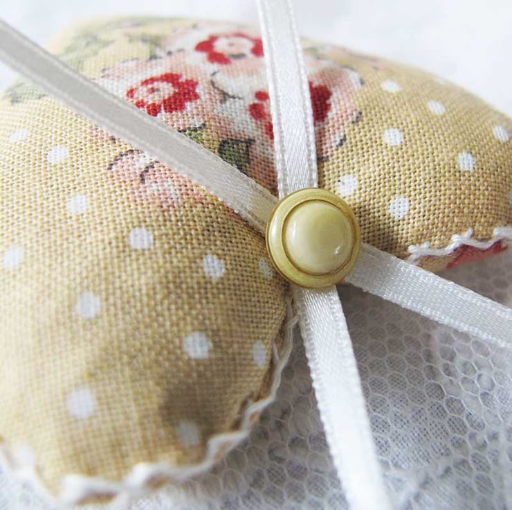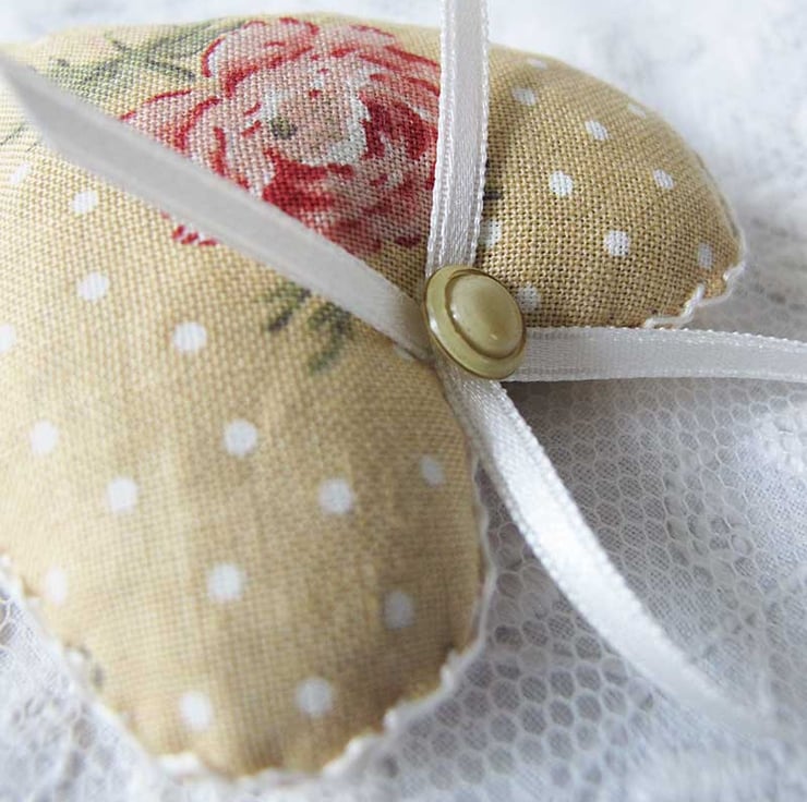 A very pretty little set of three lavender bags - hand made, filled with beautiful scented lavender and then finished with hand embroidery, co-ordinating ribbon and matching vintage buttons. They are made in co-ordinating fabrics of pale yellow with flowers and white spots, and pale yellow with an all over floral design - perfect for a Valentine, Mother's Day or spring gift. The hearts measure approximately 6cm wide x 6.5cm long (not including the ribbon)