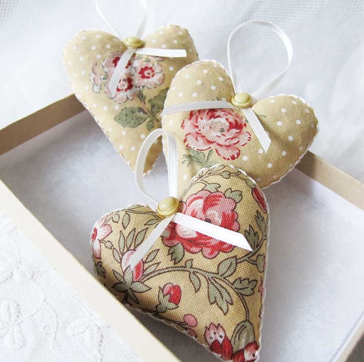 They will be carefully packaged in a hand decorated box with a ribbon. The listing is for three lavender hearts and you will receive the actual ones in the photograph. I have also shown an example of the box.
