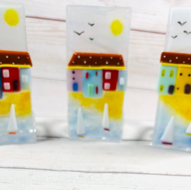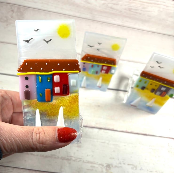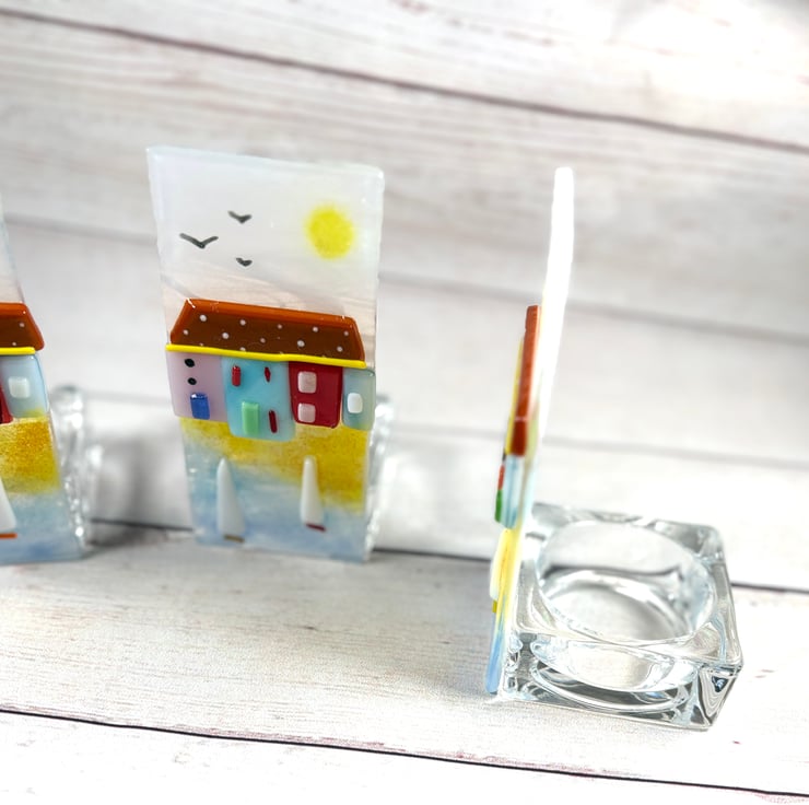Cute fused glass panel with attached glass candle crib that duals as a cute ornament and a candle holder . Perfect small gift and the vibrant colours would look great in any room . Approximately 5 inch x2.5 inch .