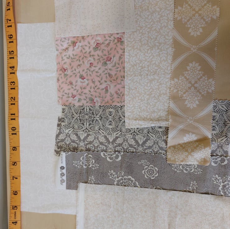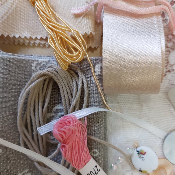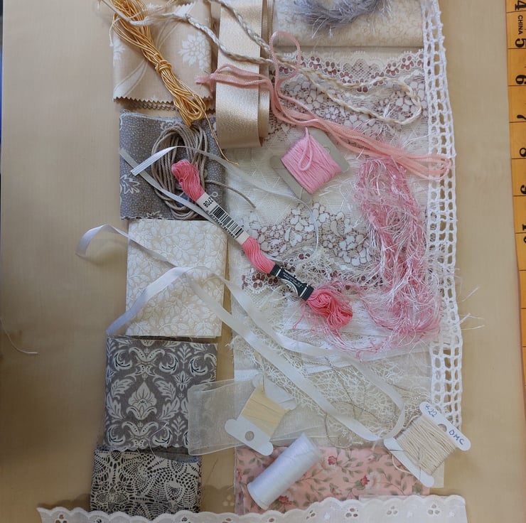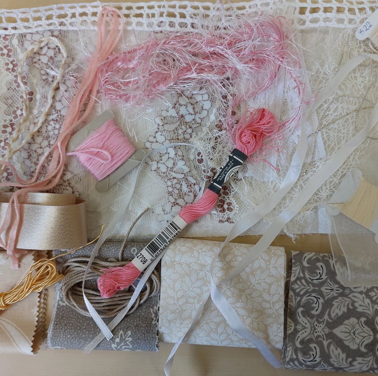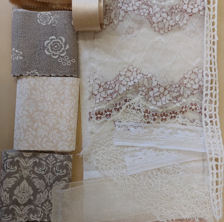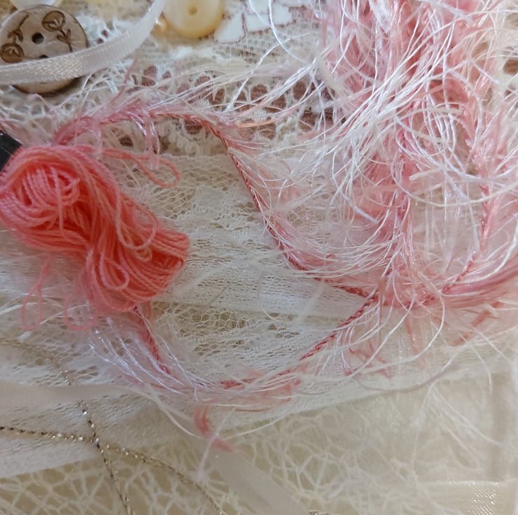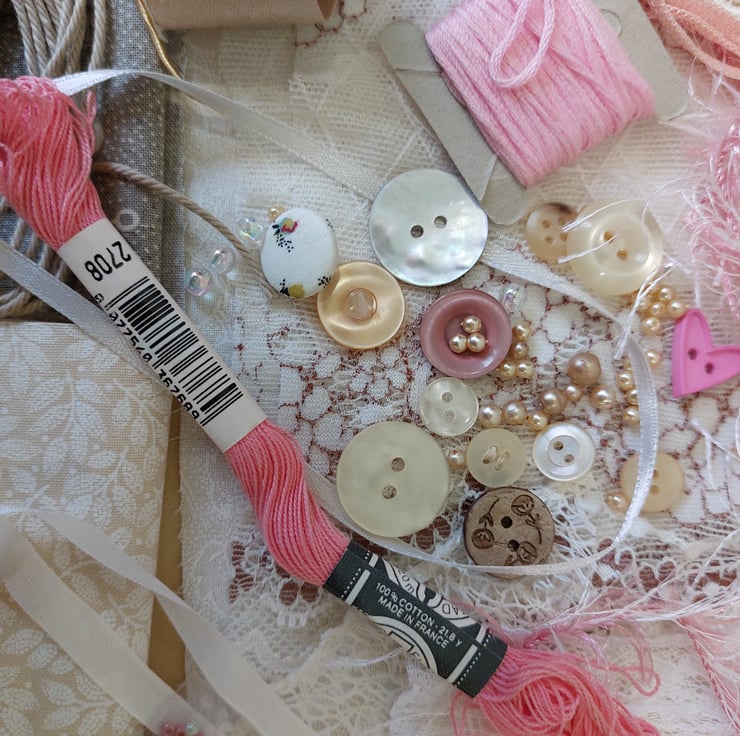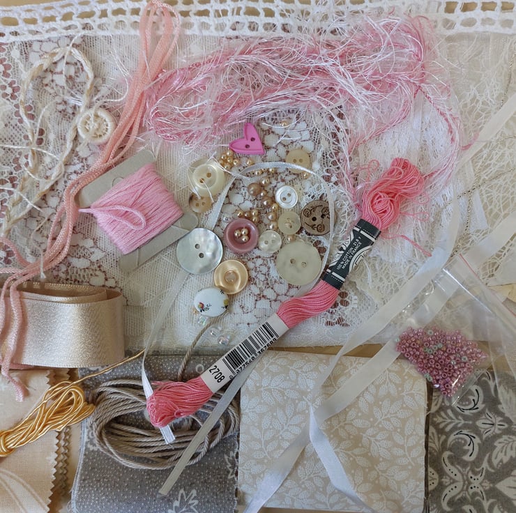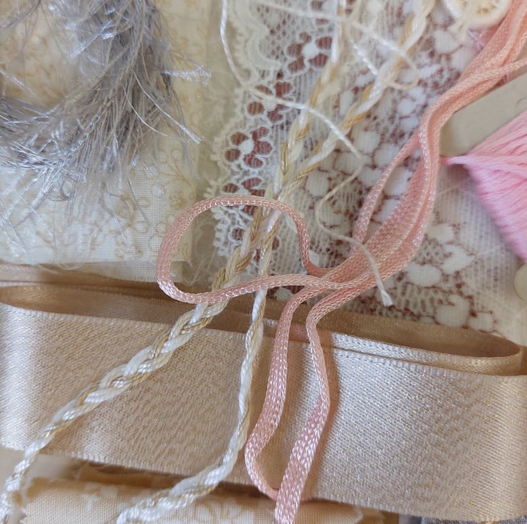 Pack of 10 fabric leftovers various sizes. Lace, ribbons, embroidery silks, buttons and beads, Ideal for textile collage, slow stitching or junk journaling. Colours are in neutrals and pinks. There are 8 kits in all and each differ very slightly. Kits will be picked at random.