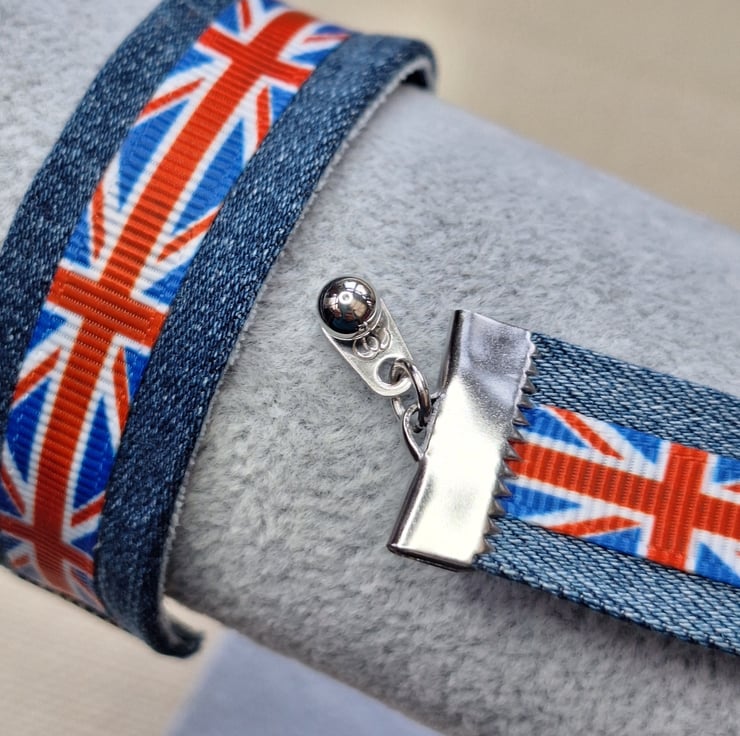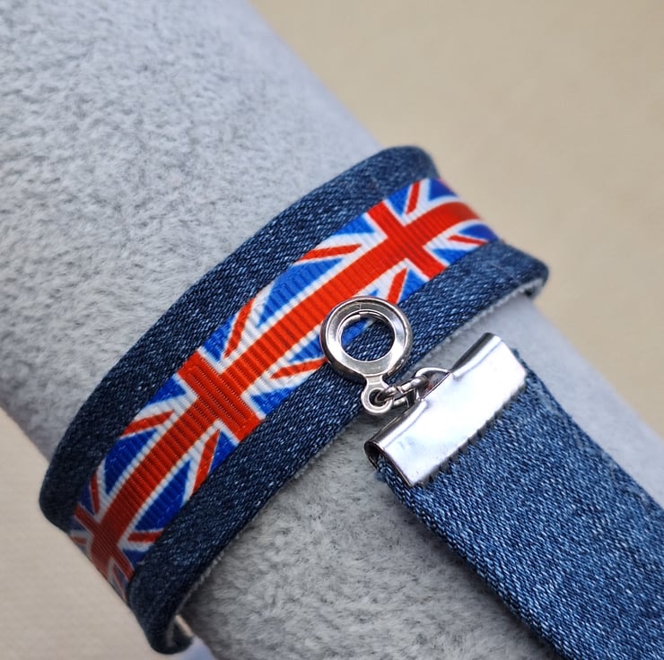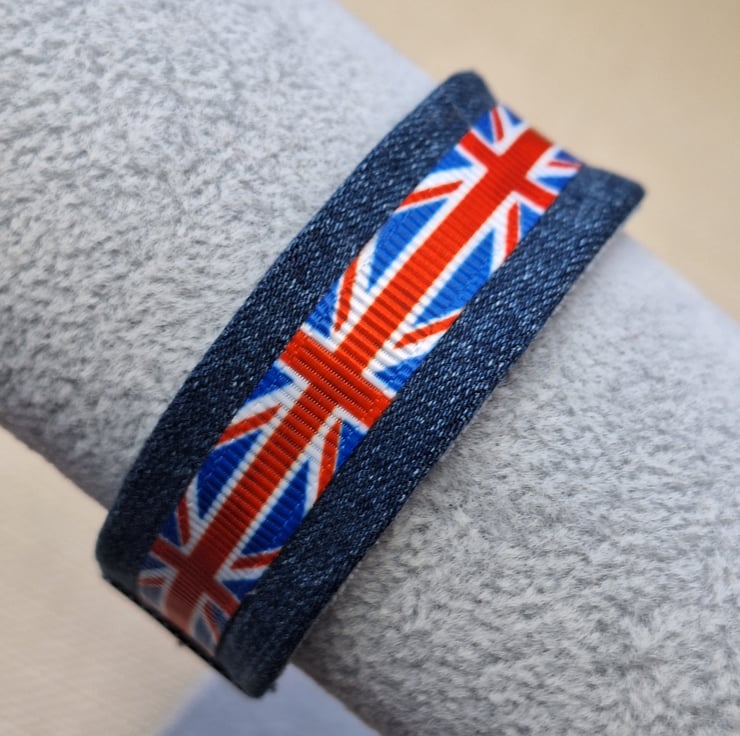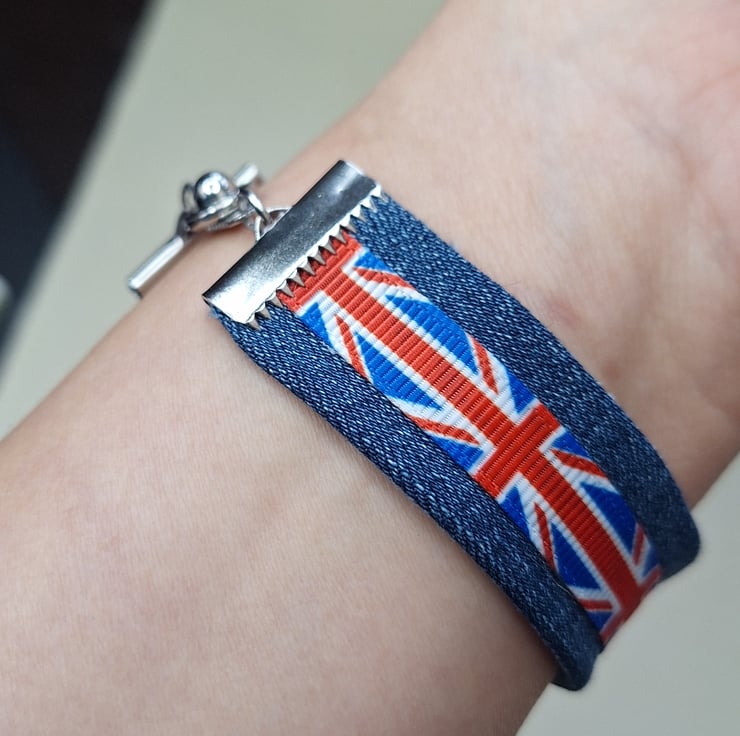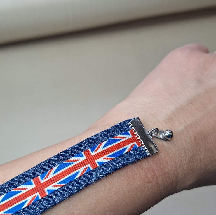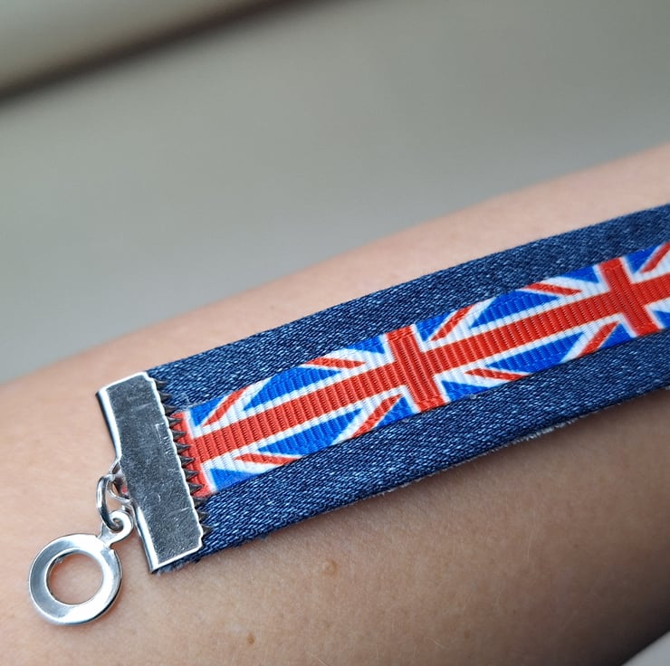 Upcycled Denim Bracelet with Union Jack Ribbon (British and Biker Vibes)