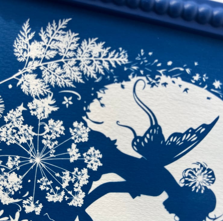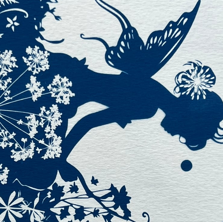 Detailed, cut-edged leaves and soft flower umbels, as well as daisies, surround her in fresh white against a Prussian blue background. It would make a lovely gift for a Christening, Naming day, Child's Nursery or a magical Birthday gift.