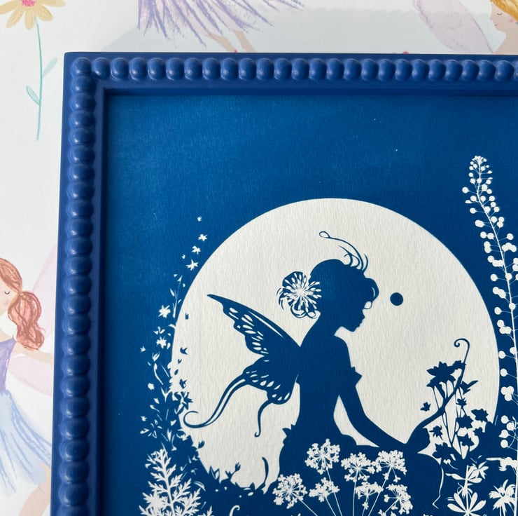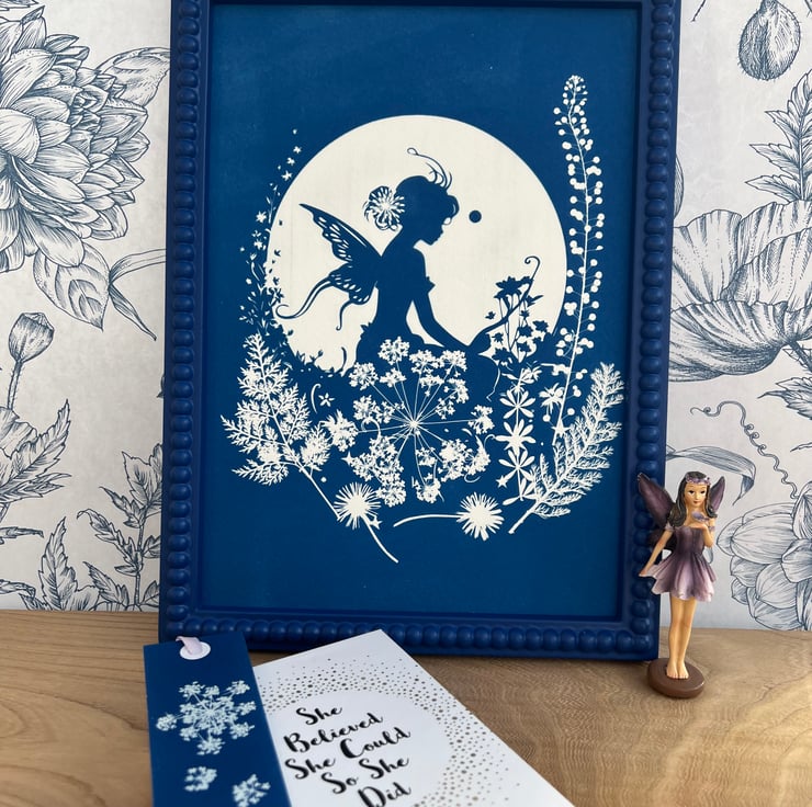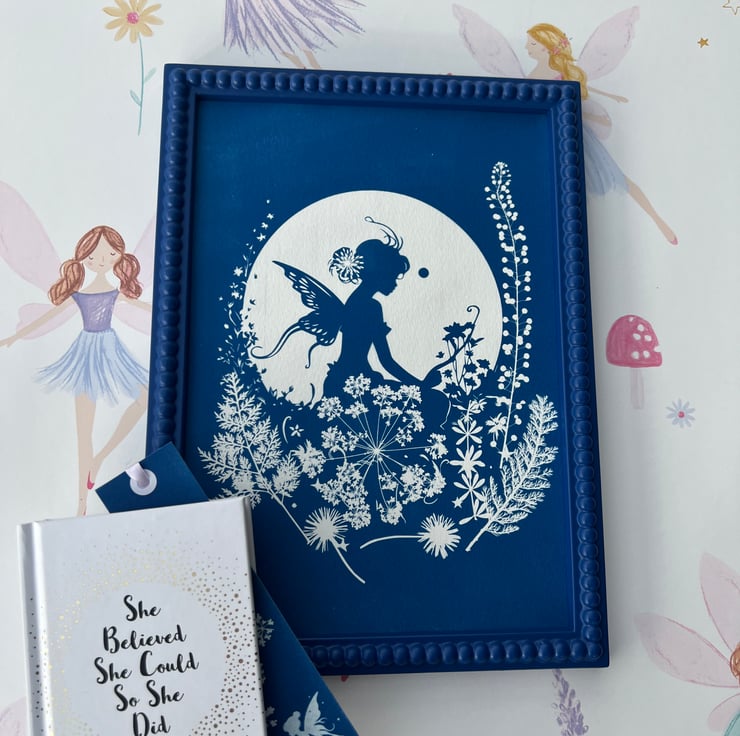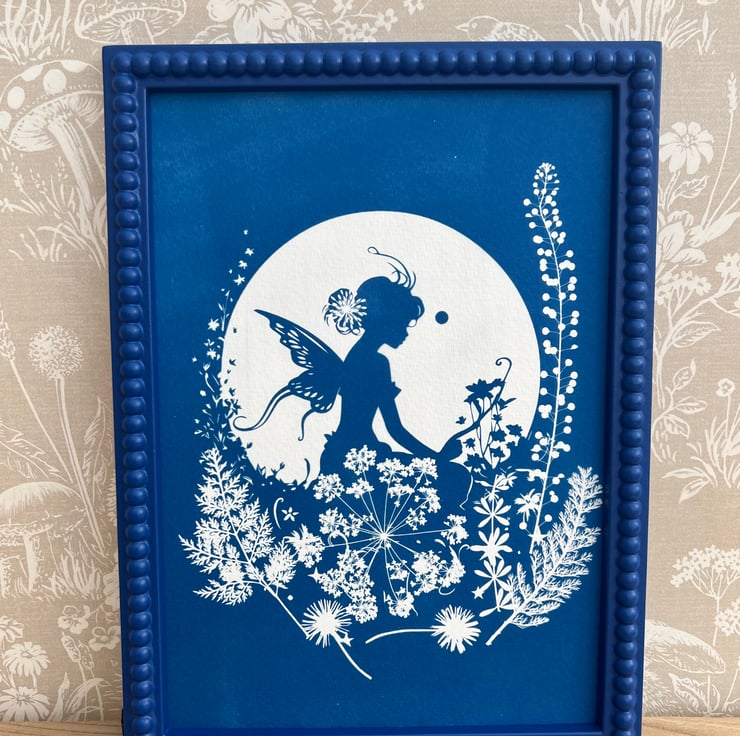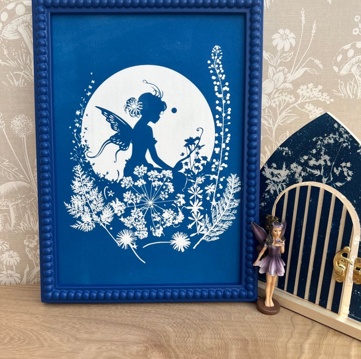 Botanical Fairy Art. This pretty piece of Cyanotype features a stencil of a fairy sitting among wildflowers and foliage, silhouetted by the moon.