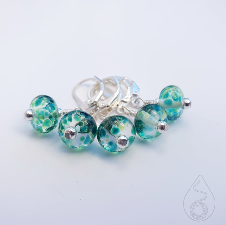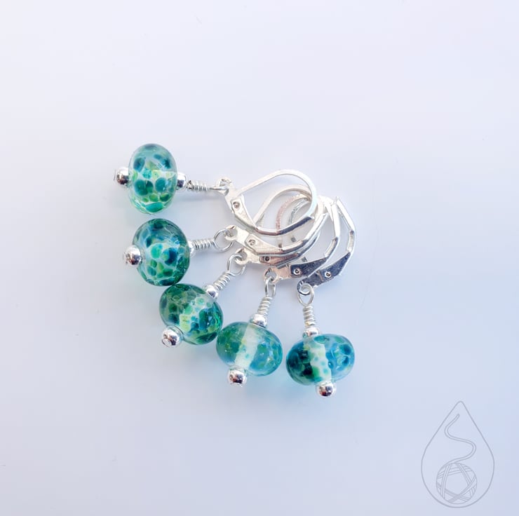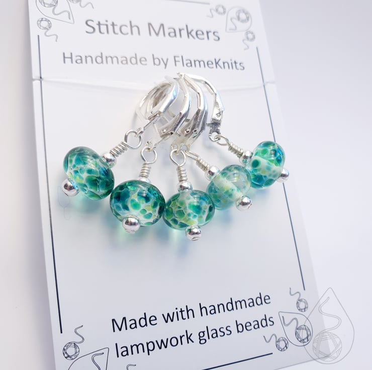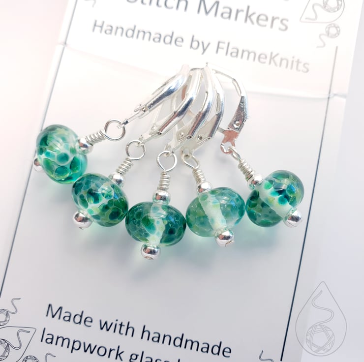 A set of 5 stitch markers made with lampwork glass beads in shades of green,