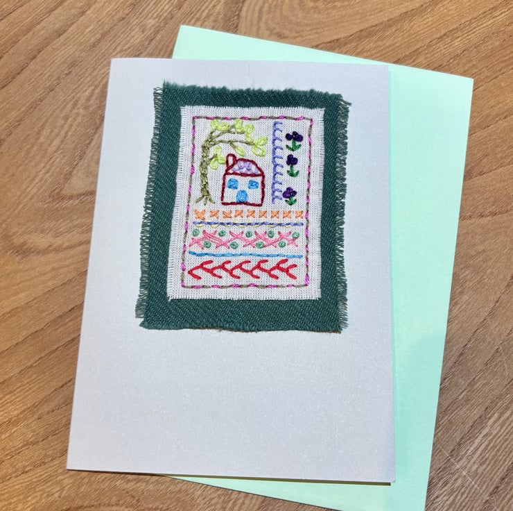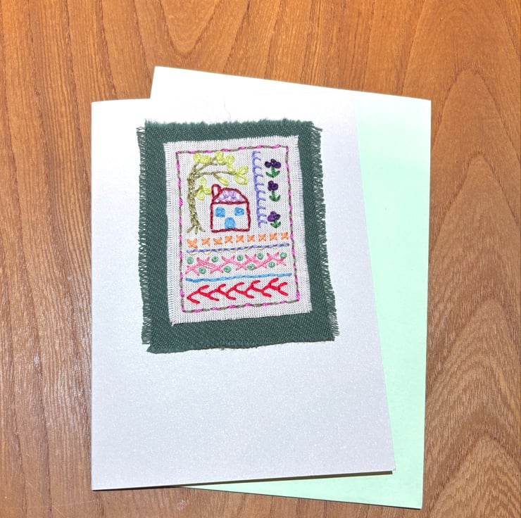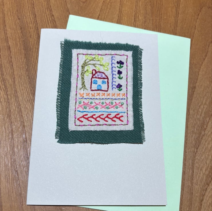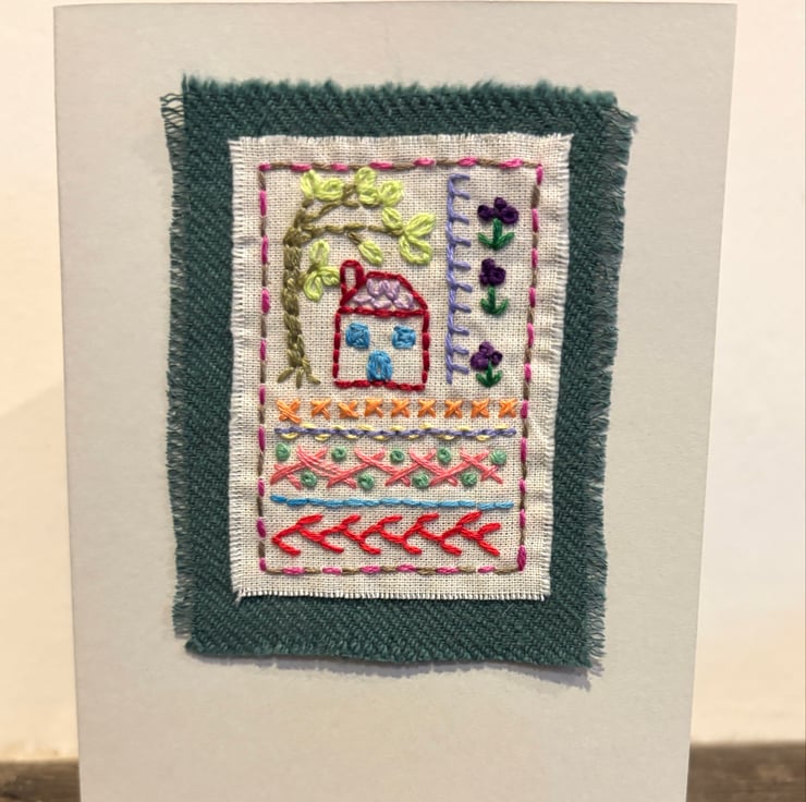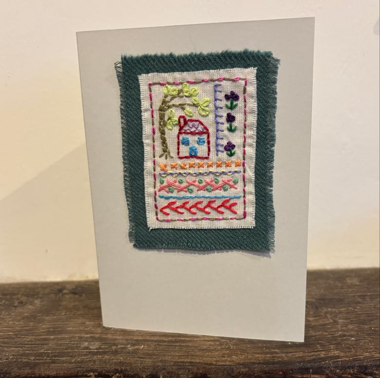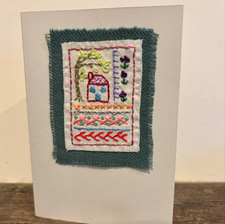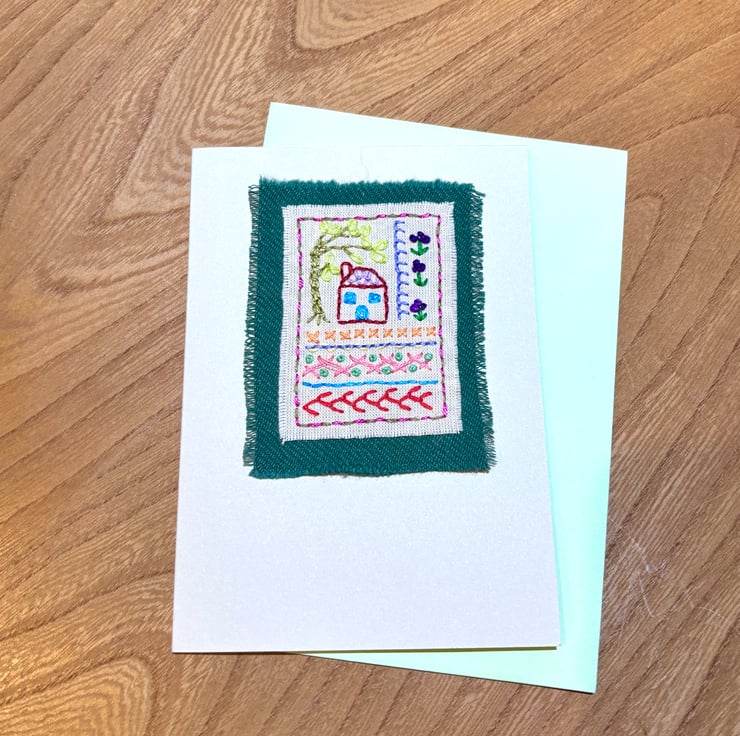 Hand embroidered card in the style of a sampler, featuring a house, willow tree, flowers and a variety of stitches. It has been left blank for your own message and could be suitable for a birthday, new home, Mothers’ day etc