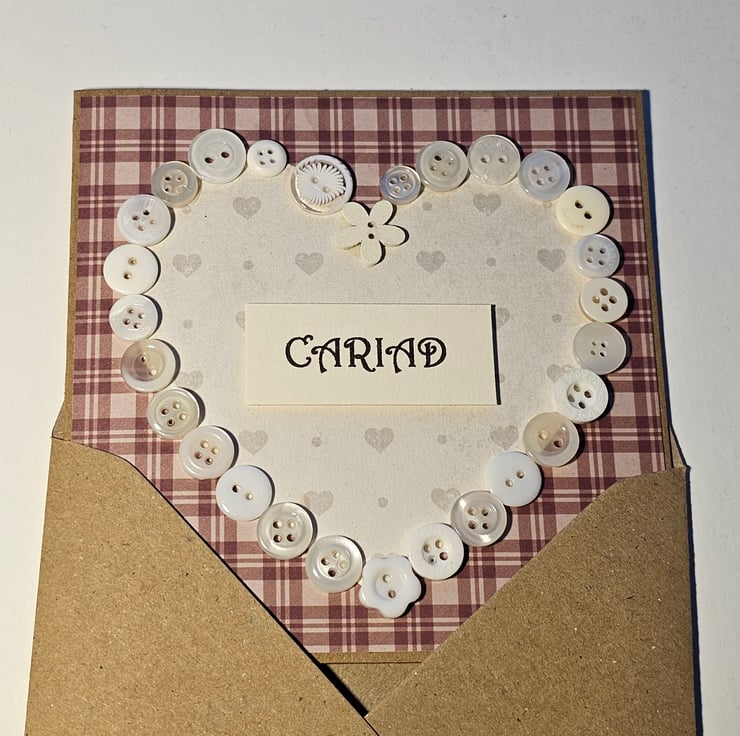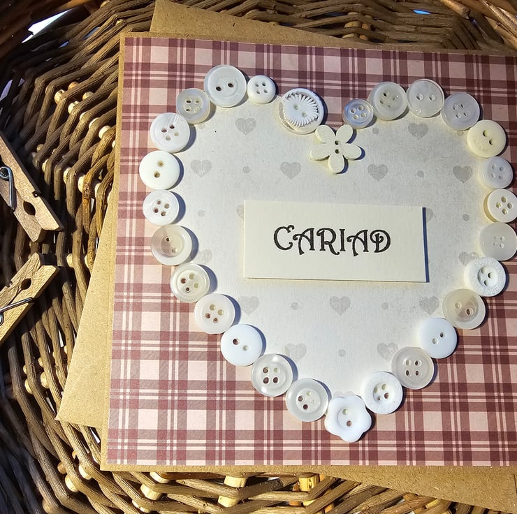 A unique handmade card to use on St. Dwynwen's Day (25 January) or Valentine's Day (14 February) or simply on any occasion when you want to send someone a note reminding them of your affection. "Cariad" means love in Welsh. It is a term of endearment which can include various forms of love (romantic, familial, etc.)