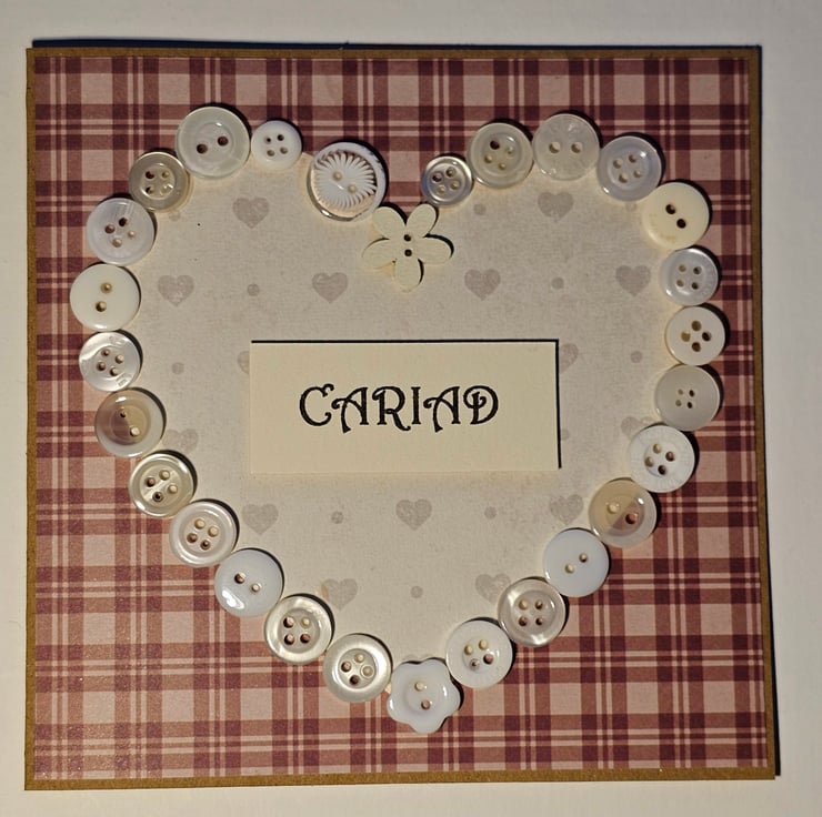 Cariad Welsh Square Button Heart Card Size 5" x 5" (12.5cm x 12.5cm)