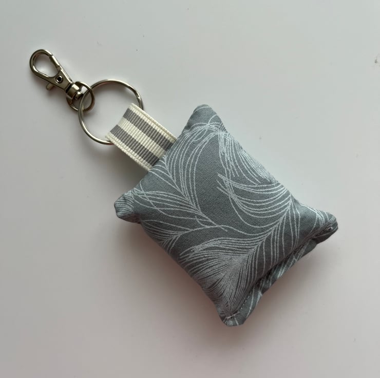 Grey pillow print fabric square keyring.