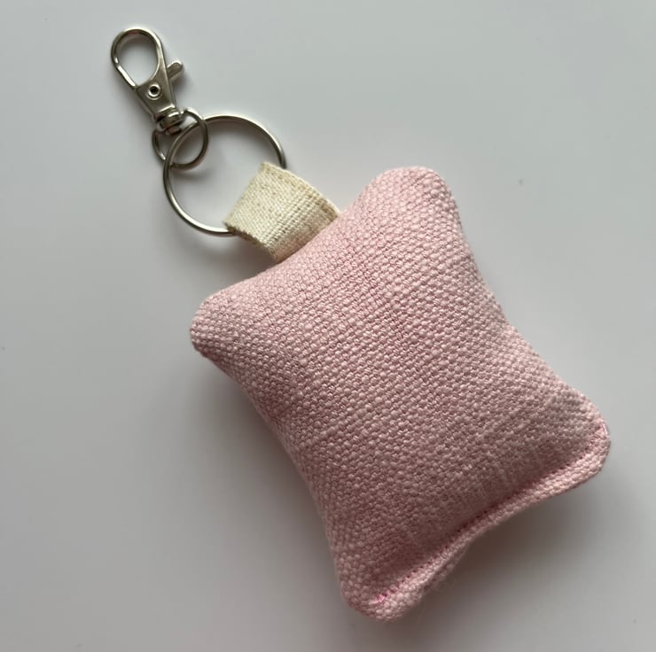 These square fabric pillow keyrings are super spongy and easy to find in your bag. They come with a clasp so you can easily attach them to your bag or purse.