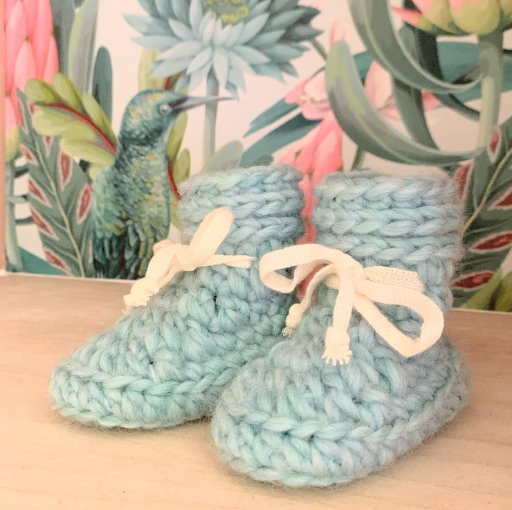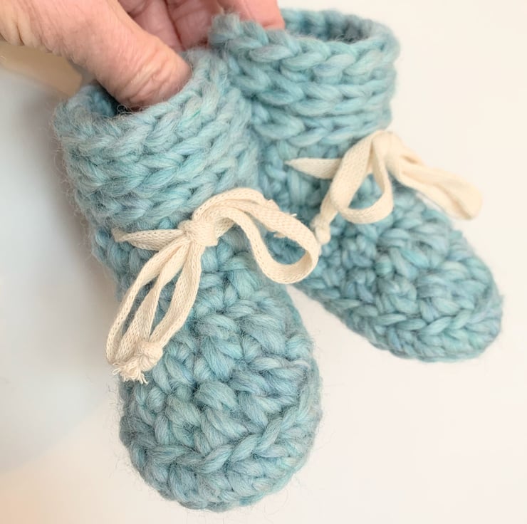 All natural fibres for these popular chunky style baby booties. Hand crocheted using 100% super chunky weight wool with 100% cotton ties, they will keep little feet toasty warm.