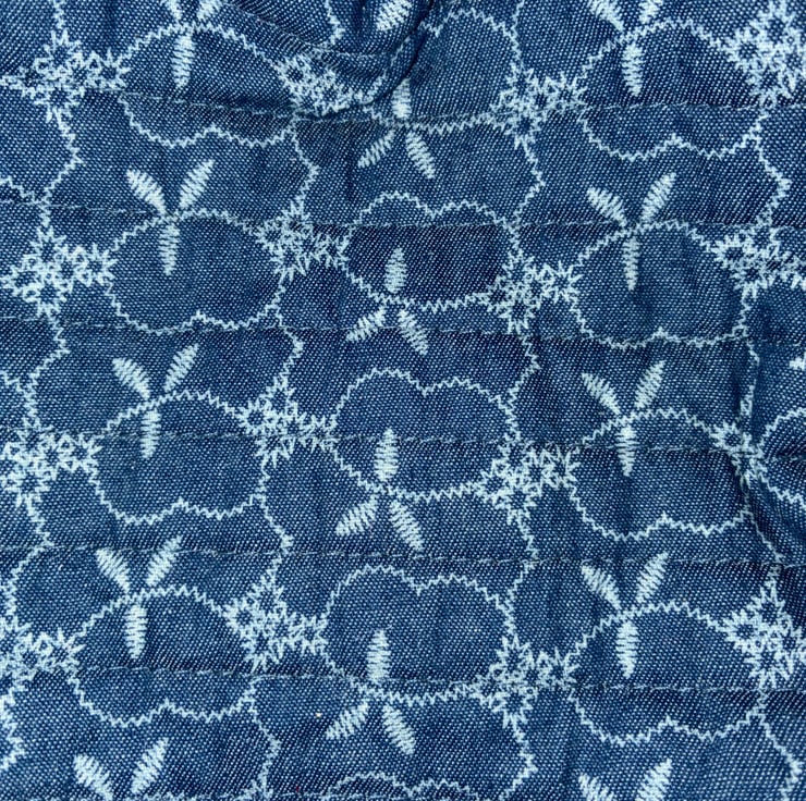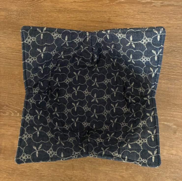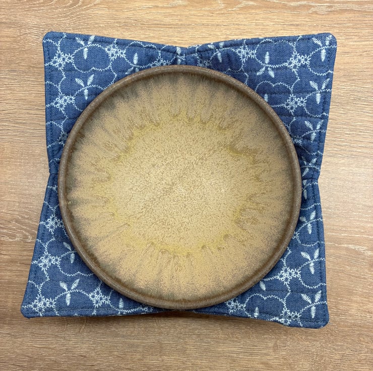 The reversible bowl cosy is made in this lovely chambray fabric with an apple design on both sides. The bowl is quilted with blue stitching.