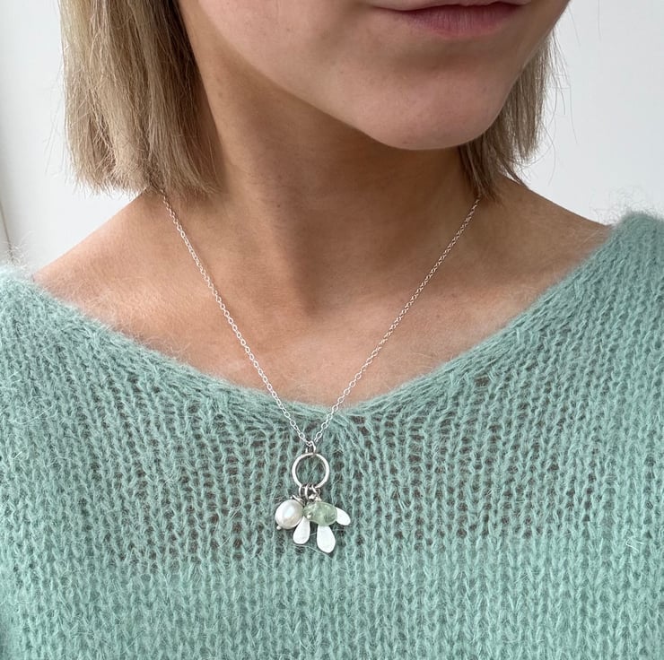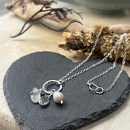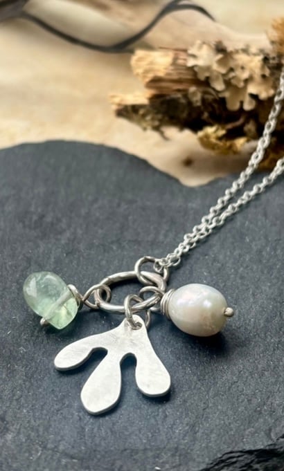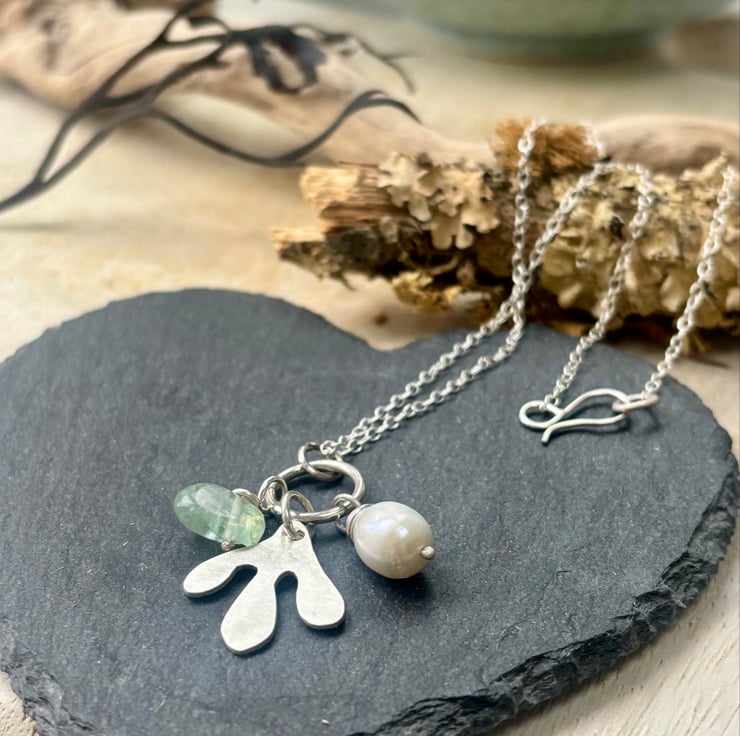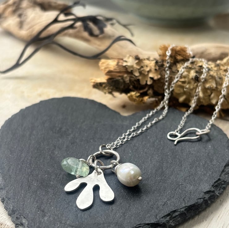 Pretty recycled silver handmade necklace with recycled silver seaweed inspired shape hand sawn in satin finish with freshwater pearl drop and aventurine drop both on handmade silver wires finishe on silver 18 inch trace chain with handmade S shaped clasp