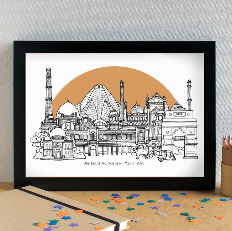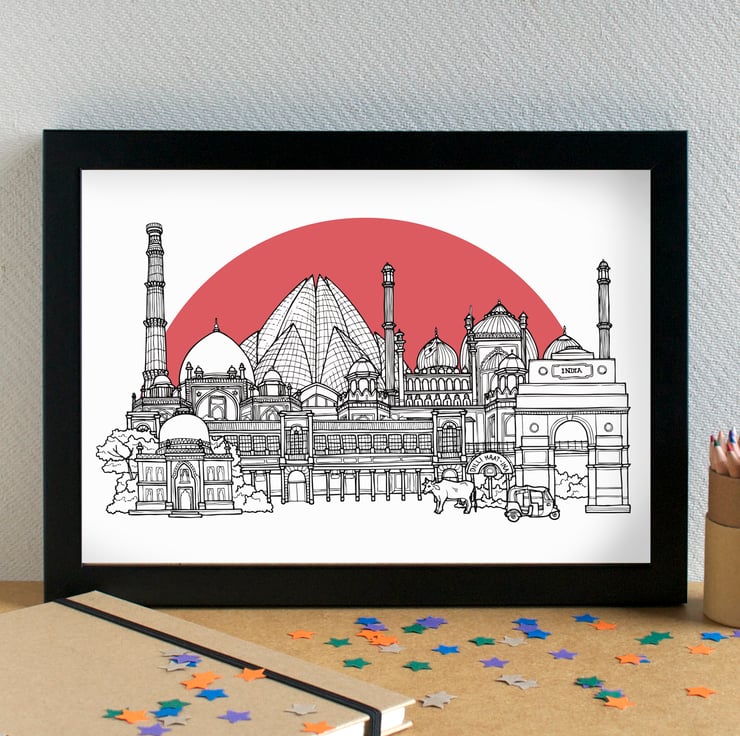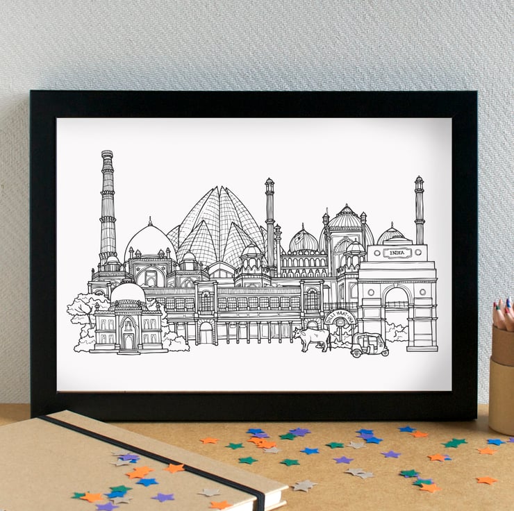 A stunning art print of my line drawn skyline illustration of the most famous landmarks in magical Delhi.