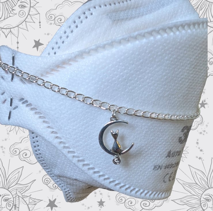 Mask chains are a great way of dressing up your mask, coordinating it with your outfit, or just making your respirator feel more 'you'. This lightweight silver plated mask chain featuring a sweet cat on a moon charm adds a subtle but fun accent to your respirator. It can be worn either way around so that the kitty can be on the left or right. 24cm long as standard, or I can adjust it to your own measurements (recommended - see below!)