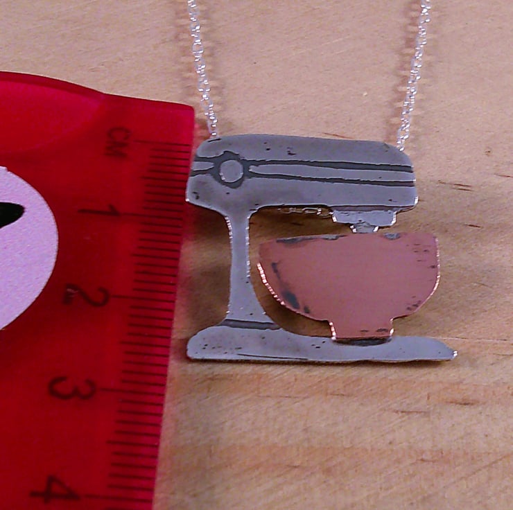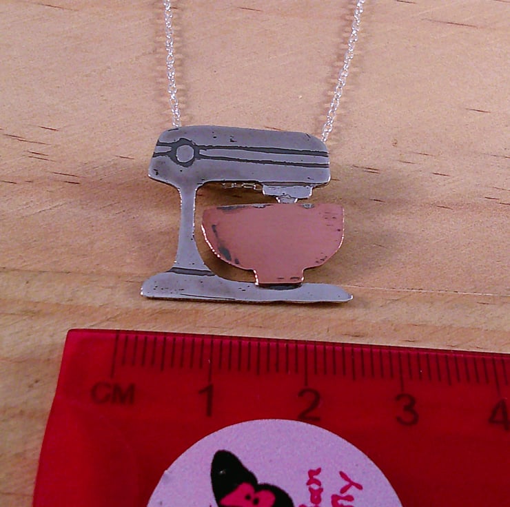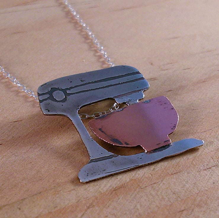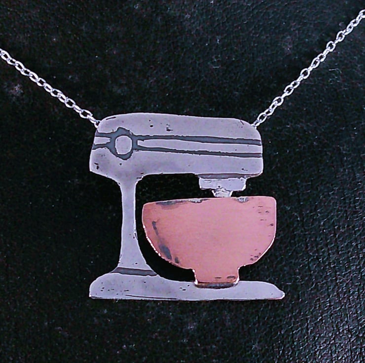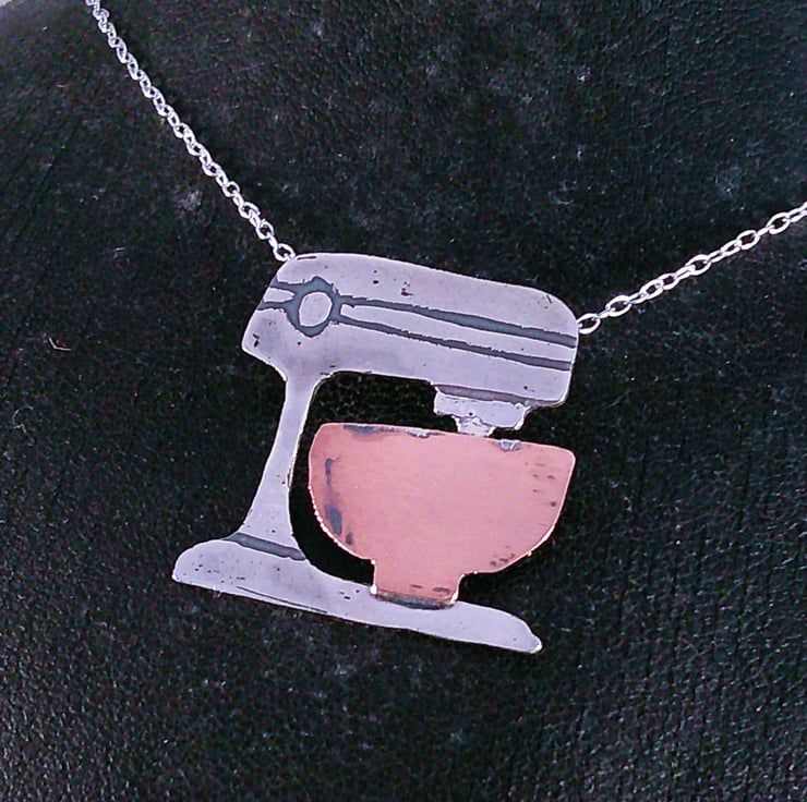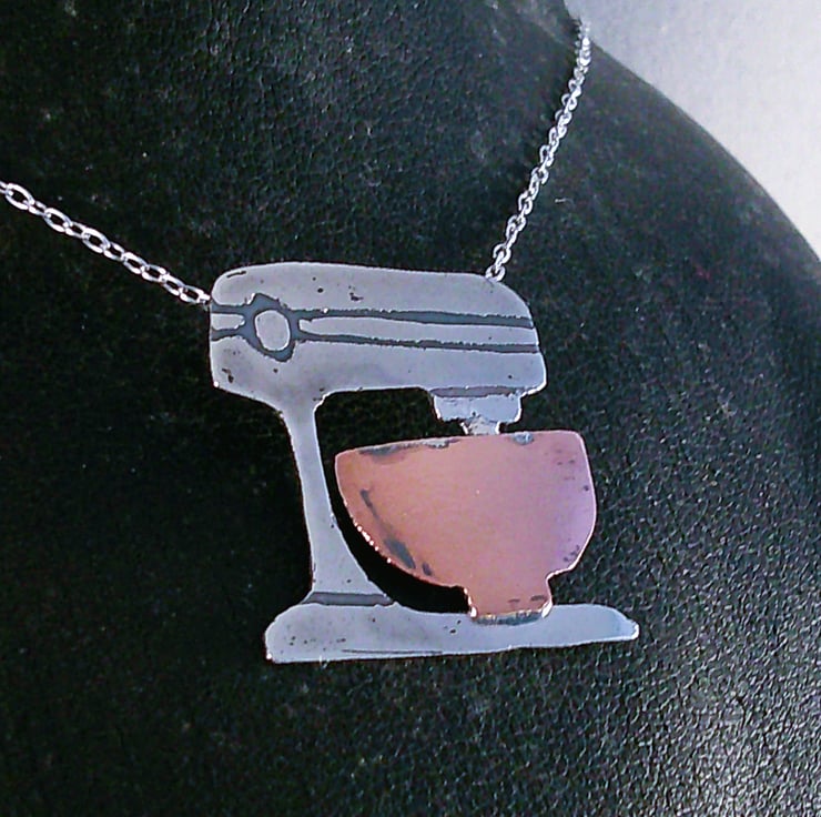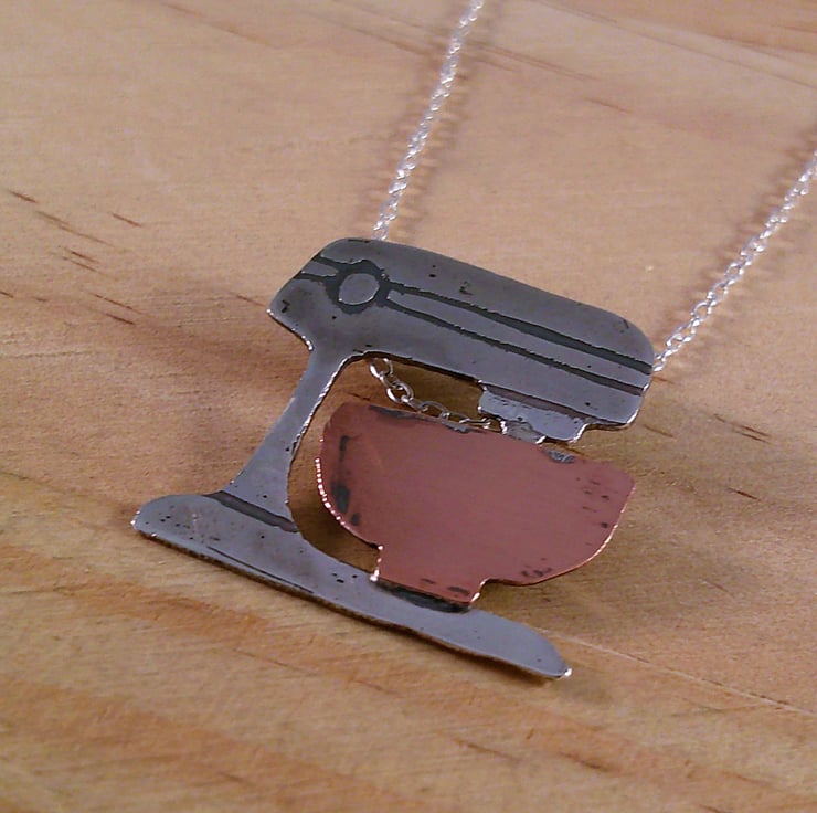 The shape of an electric stand mixer has been hand pierced from a sheet of 100% recycled sterling silver and etched with the details. The bowl has been hand pierced from copper and soldered on, and loops soldered ot the back for the chain. The necklace has been oxidised to blacken the etched details.