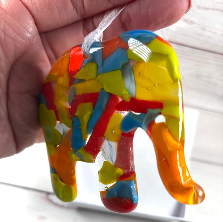 Gorgeous fused glass vibrant glass elephant hanging ornament perfect for the elephant lover in your life. Created using vibrant shades of opaque fused glass . The hanging would look gorgeous either on a wall or at a window . Approximately 4 inch diameter , drilled and ready to hang . The elephant comes in a white gift box no two elephants are the same