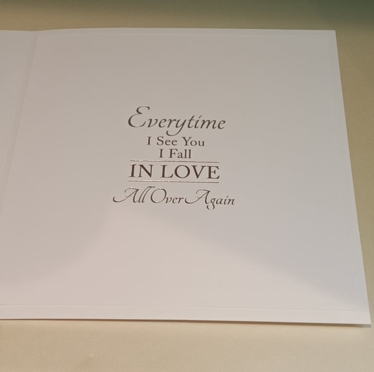 Inside is a printed insert with the words "Everytime I See You I Fall In Love All Over Again"