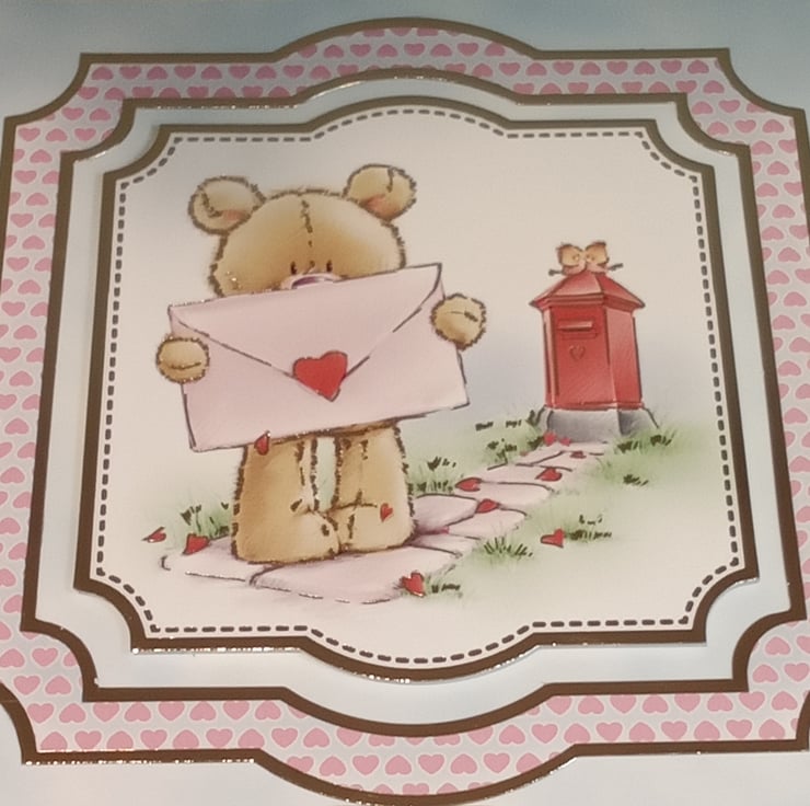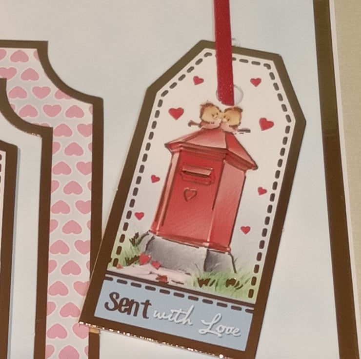 The shaped frame has a pattern of pink hearts and has been glued flat to the card then the Teddy Bear topper placed inside the frame using 3D foam pads to lift it slightly. Down the right side I've added a narrow red ribbon with a tag shaped topper that has the words "Sent With Love"
