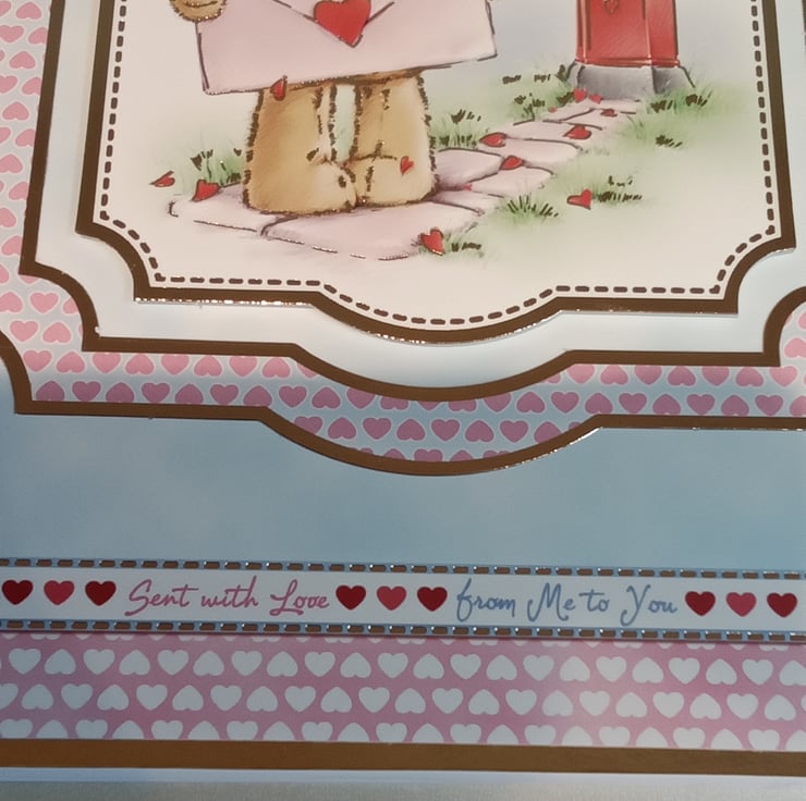 The background card has a border of hearts along the bottom with a narrower border featuring the messages "Sent With Love" and "From Me to You" I layered it onto gold foiled card before placing it on the card front.