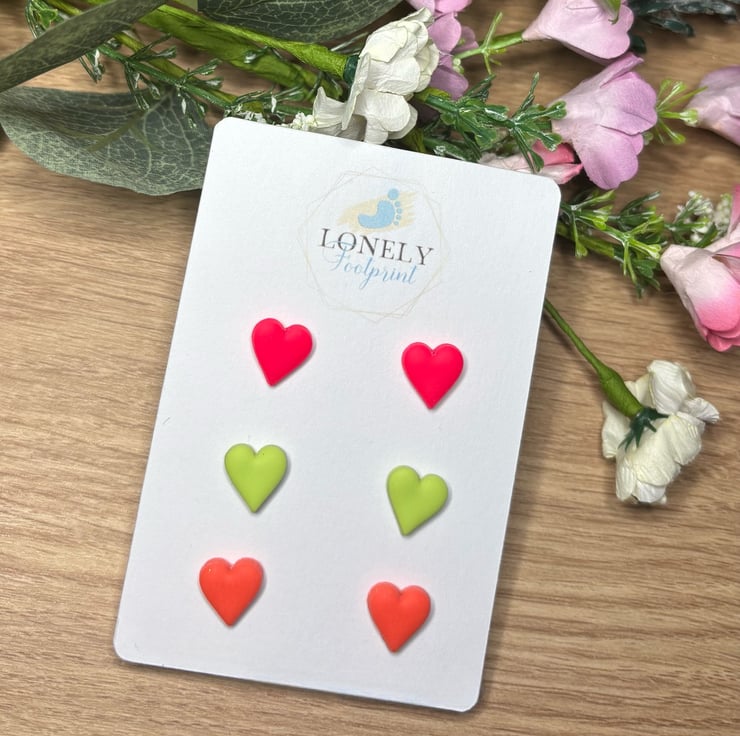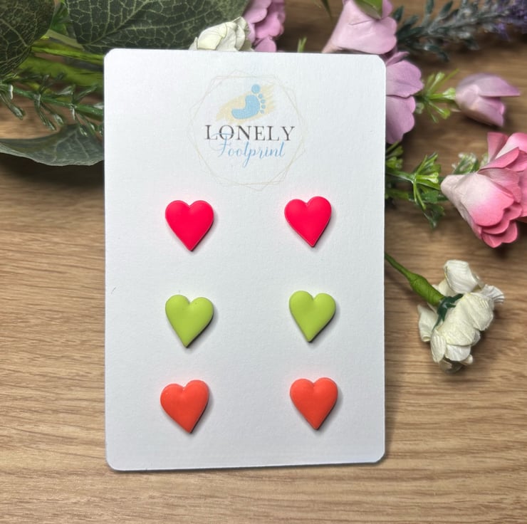 Bright pink, orange and green studs handmade from polymer clay. Lightweight and perfect for treating yourself or gifting someone special.