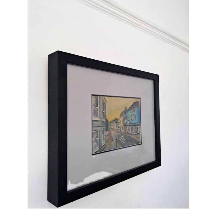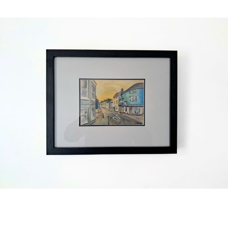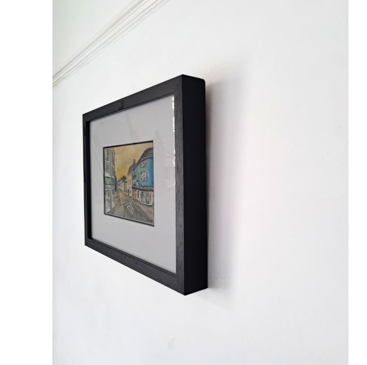 This small postcard style work is painted in artist grade Winsor and Newton watercolour paints on Bockingford 200 gsm cold pressed paper, It has been professionally framed in a black wooden glazed frame, suiting a range of decors and is ready to hang.