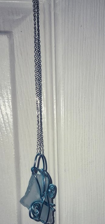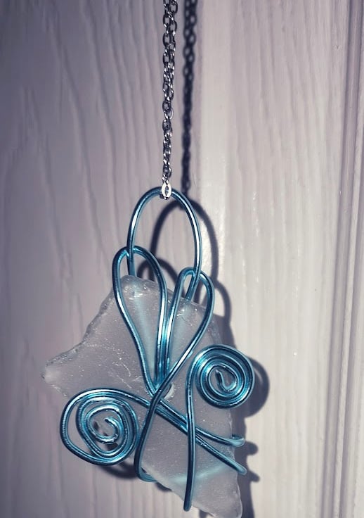 This one-of-a-kind necklace features a piece of white frosted glass, hand wrapped in blue-toned jewellery wire with decorative spiral detailing.