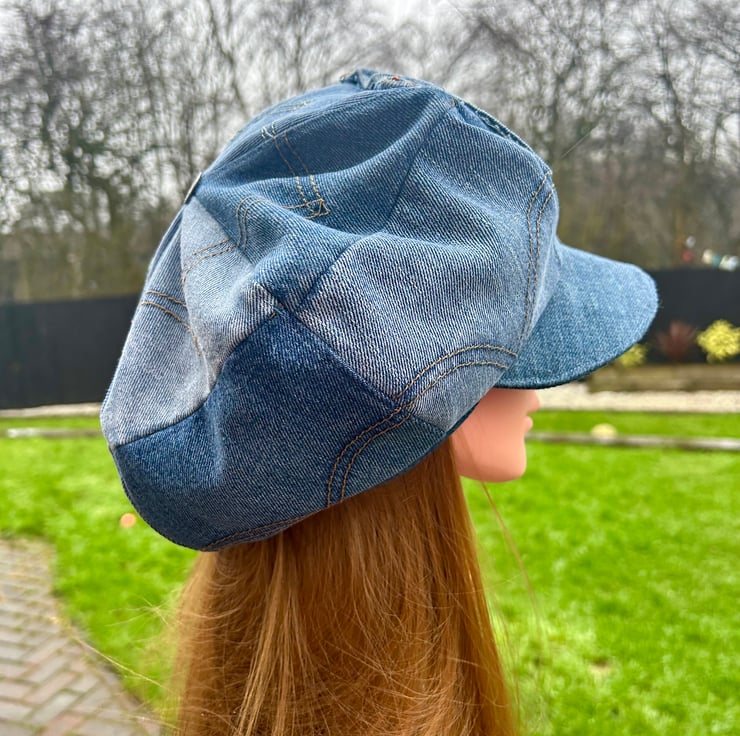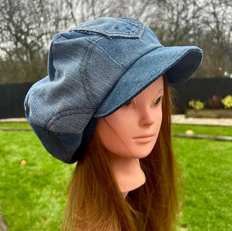 Denim baker boy cap made from Levi’s jeans pockets all stitched together randomly for a vintage/grunge style.